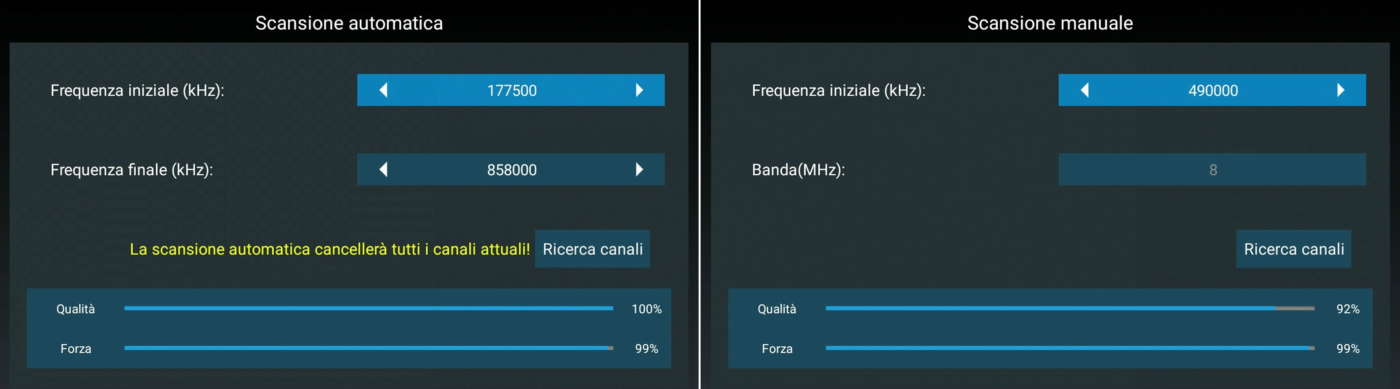 Per ripetere la ricerca automatica o lanciare quella manuale (singola frequenza VHF o UHF) bisogna accedere al sottomenu Fonti Canali (Opzioni Tv > Impostazioni), cliccare su HDTV e poi su Scansione automatica o Scansione manuale.