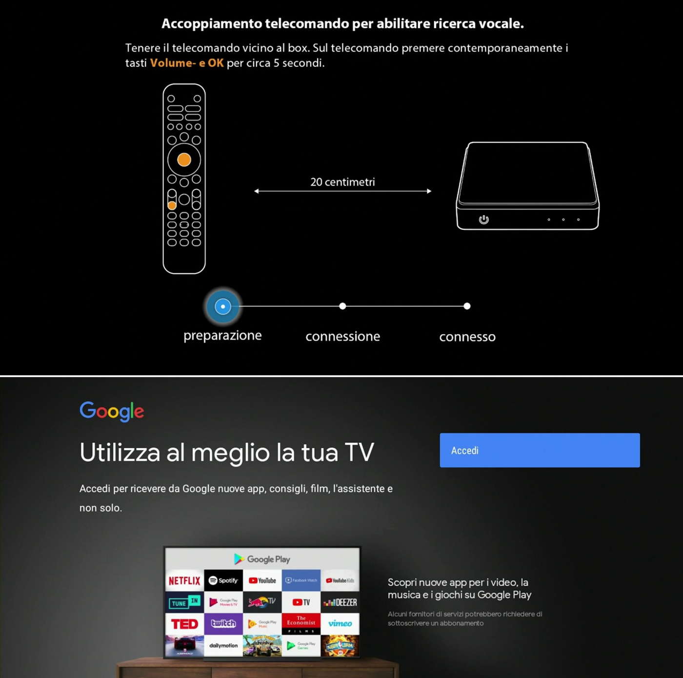Riguardo invece il setup iniziale, bisogna solo associare il telecomando allo SmartBox premendo due tasti del telecomando, scegliere la lingua, la connettività Ethernet oppure Wi-Fi e loggarsi a Google.