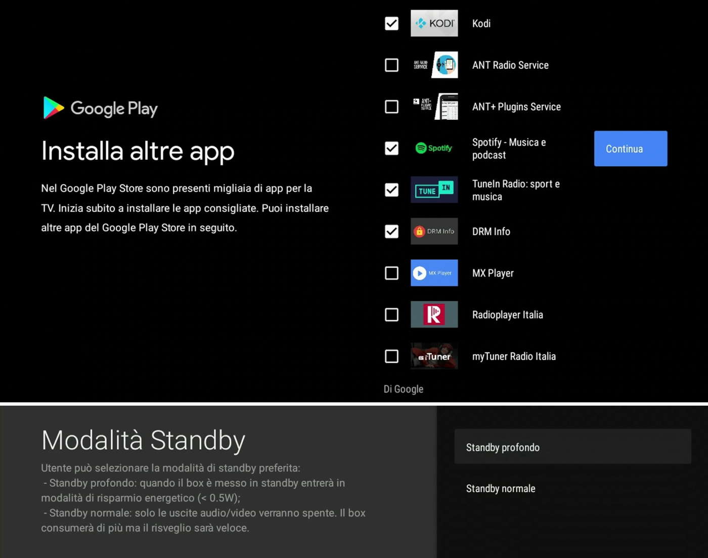 Dopo aver settato le varie opzioni di Google (posizione, diagnostica, ecc.), è possibile configurare il controllo vocale, selezionare le app suggerite e la modalità di standby tra normale e profondo (per ridurre i consumi energetici).