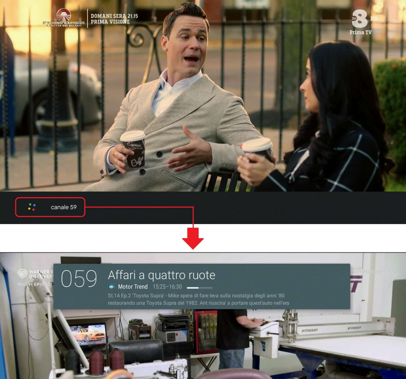 Per selezionare i canali DTT basta premere i tasti P +/- oppure le frecce su/giù del telecomando (zapping sequenziale), digitare il numero del canale (es.: 31 per Real Time) o, più comodamente, chiedere a Google Assistant di richiamare il canale desiderato (es.: “Canale 59” o “Metti Rai 1”).