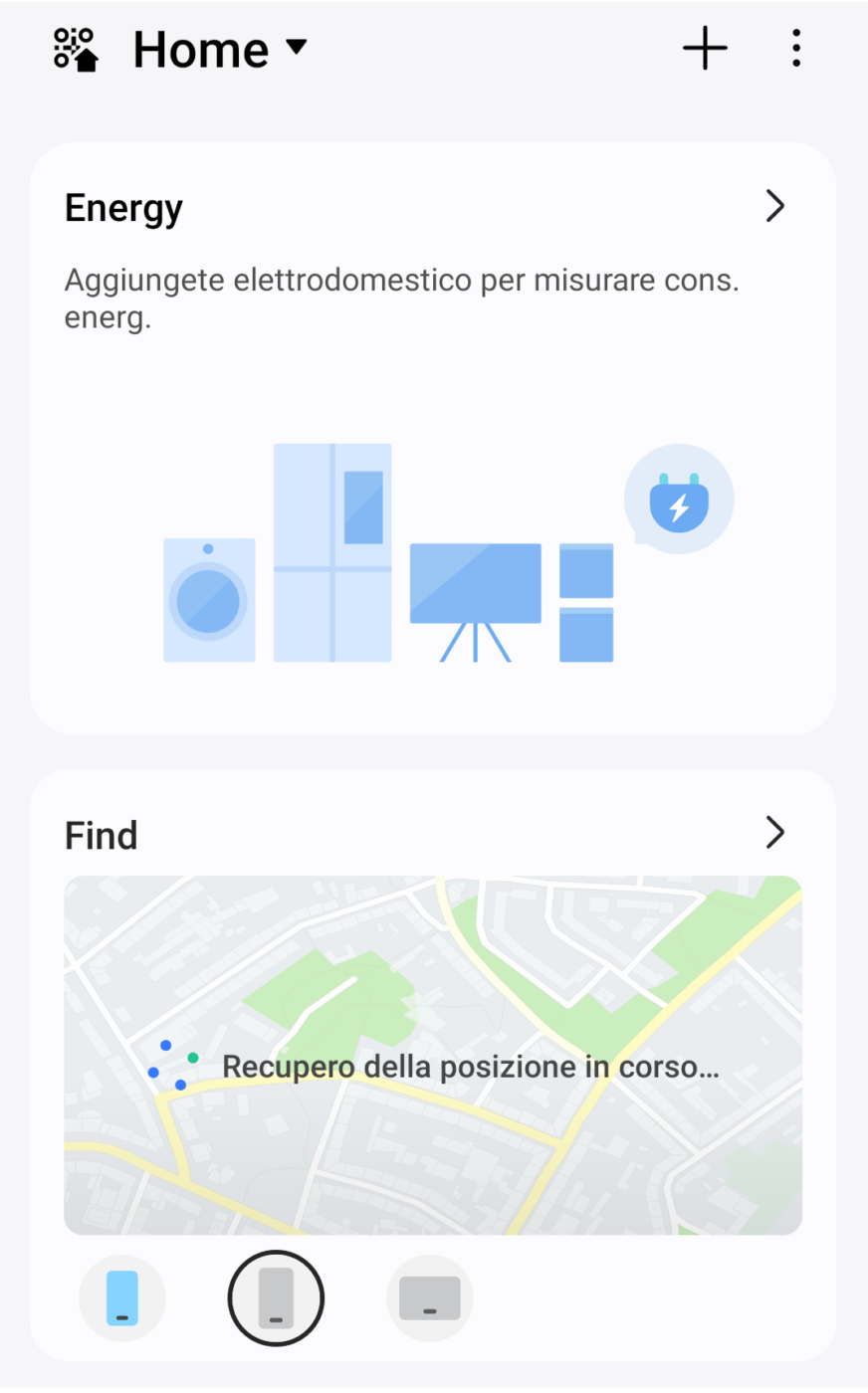 Dopo aver lanciato la app SmartThings basta cliccare in basso su Life e selezionare il box Find per installare automaticamente i componenti necessari all’acquisizione e alla gestione dello SmartTag 2.