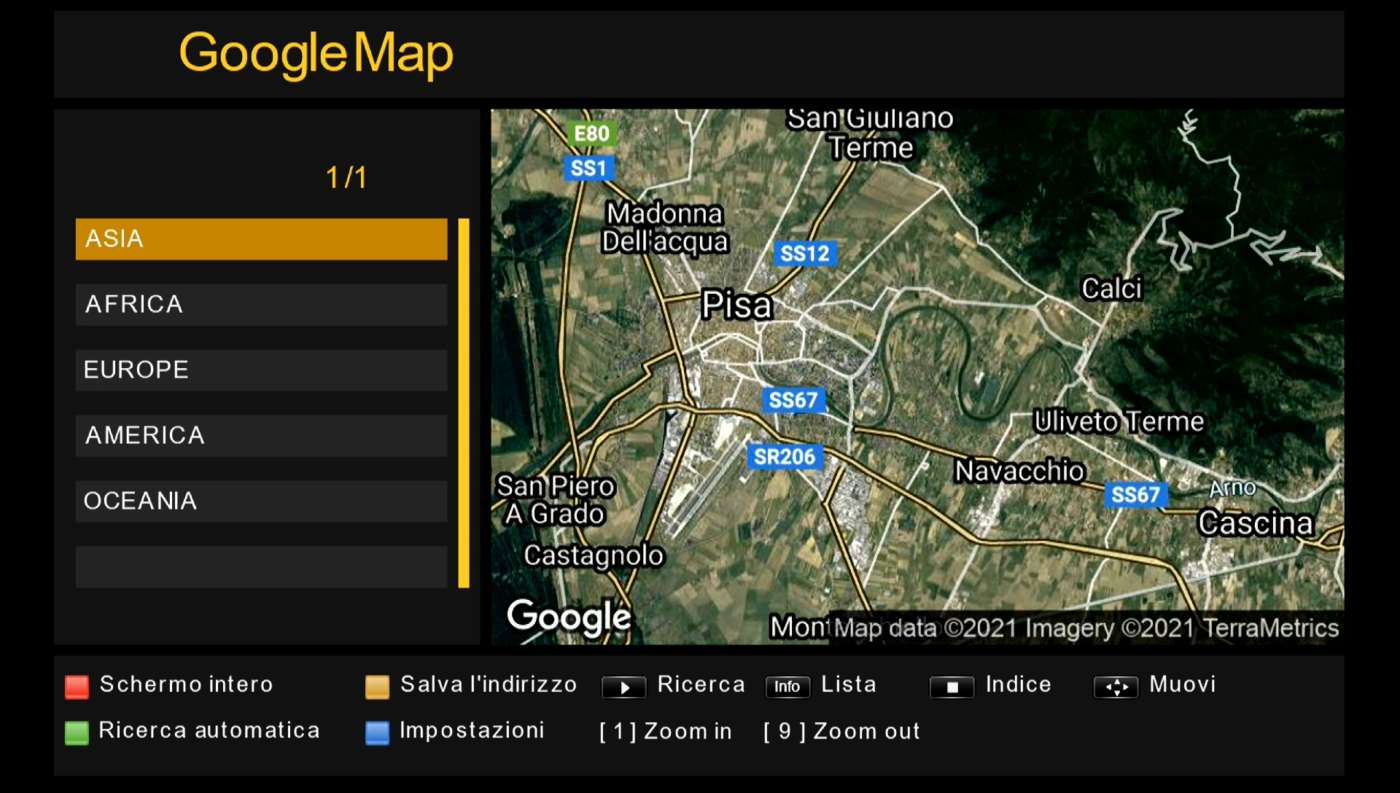 È possibile anche richiamare una località principale dall’elenco a sinistra (continente, paese), salvare la posizione sulla mappa e richiamarla in qualsiasi momento (Search List – tasto INFO), spostarsi con i tasti freccia, configurare la lingua (anche italiana) e il tipo di mappa (stradale, satellitare, ibrida, terreno). Anche se ormai tutti possiedono uno smartphone con le mappe di Google, riteniamo sia comunque utile poterle visualizzare sul grande schermo del Tv del salotto e condividerle con amici e familiari.