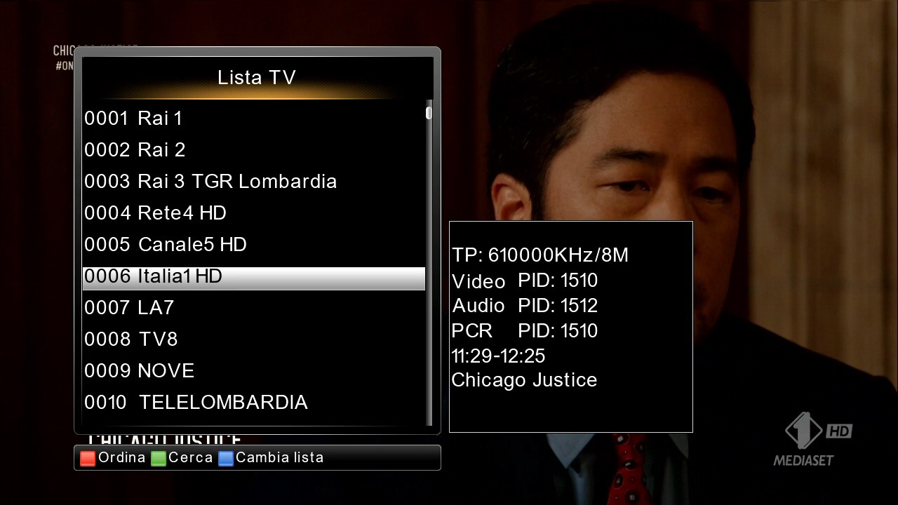 Per richiamare istantaneamente la lista dei canali basta premere il tasto OK, scorrere con i tasti freccia su/giù (singolo canale) o destra/sinistra (pagina). Per ogni canale vengono mostrati i dati tecnici (frequenza, PID, titolo evento in onda con orario di inizio/fine) mentre con i tasti colorati è possibile cambiare ordinamento (rosso – A/Z, Z/A, 0-9, 9-0, bloccati-sbloccati, sbloccati-bloccati, codificati-in chiaro, in chiaro-codificati, frequenza), passare alle altre liste (blu – radio, preferiti) e utilizzare il motore di ricerca per trovare il canale desiderato digitando alcune lettere del nome (verde). Da segnalare anche la funzione RECALL che serve a richiamare gli ultimi due canali sintonizzati.