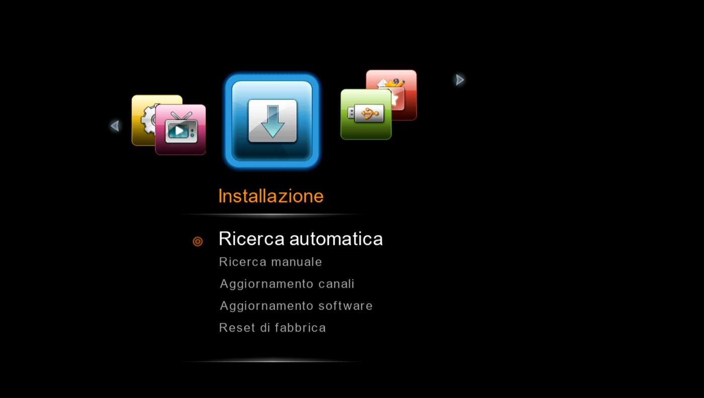 Installazione permette di accedere alla ricerca automatica e manuale dei canali (argomento affrontato nel prossimo paragrafo), abilitare e personalizzare le funzioni di aggiornamento canali e firmware (in modalità on/standby, con frequenza giornaliera/settimanale e all’orario desiderato, via OTA, USB e FTP), resettare il decoder per riportarlo nelle stesse condizioni in cui si trovava appena tolto dalla sua scatola.