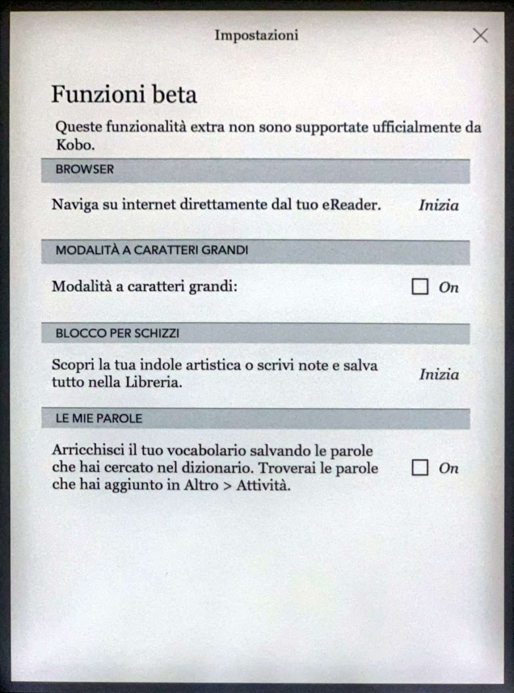 La sezione dedicata agli account consente di sincronizzare il dispositivo con il servizio Pocket e con Adobe Digital Editions, oltre allo store Kobo. L’impostazione del parental control, che blocca l’accesso al Kobo Store e alle funzioni basate su Internet, può essere utile anche per limitare le distrazioni e gli elementi potenzialmente indesiderati durante la lettura. Le funzioni Beta, infine, includono una modalità a caratteri grandi per chi ha problemi di vista, una funzione per salvare le parole cercate sul dizionario e un blocco note che consente di scrivere a mano libera e salvare le annotazioni sul dispositivo.