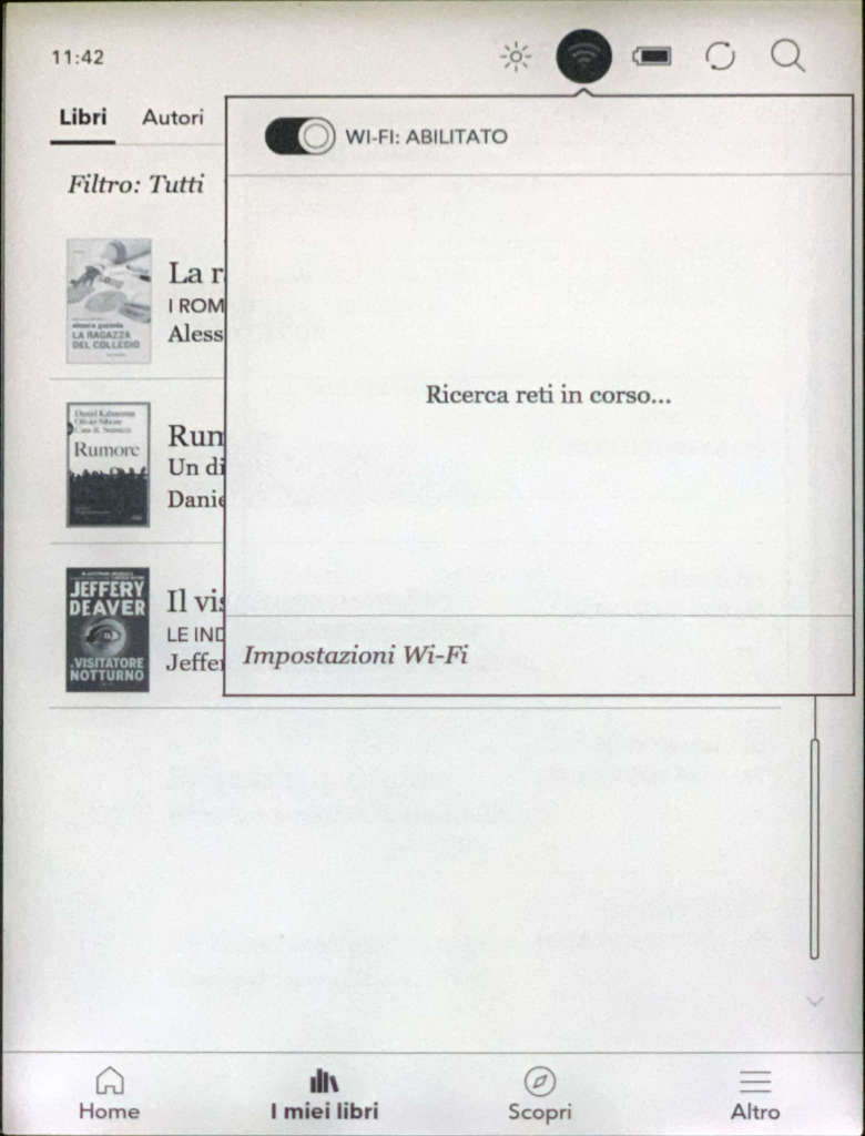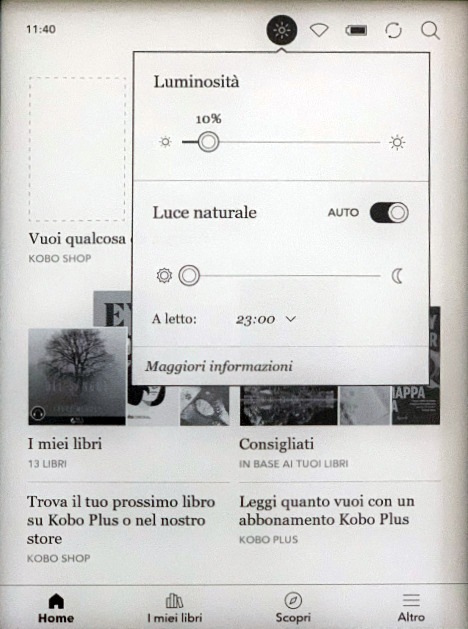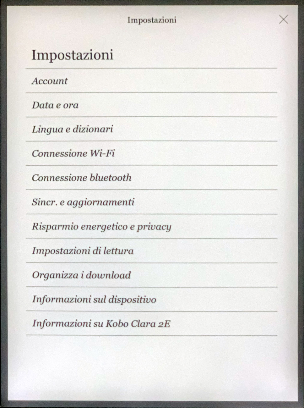 L’ultima icona del menu principale offre un menu di configurazione completo, che consente di attivare funzioni e strumenti avanzati. Tra le molte opzioni si trovano quelle per modificare la risposta dello schermo ai diversi input per muoversi tra le pagine e per cambiare le informazioni visualizzate durante la lettura. La modalità scura, che inverte i colori del testo e dello sfondo, può essere applicata unicamente alle pagine del libro, lasciando l’interfaccia inalterata.