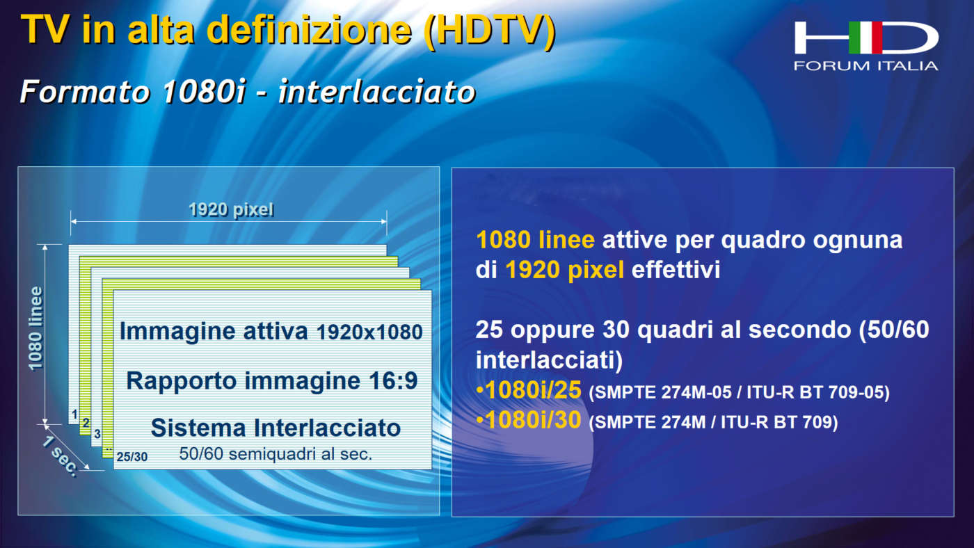Il formato 1080i, che spesso viene affiancato all’HD (come il 720p) perché interlacciato e quindi “non completo”, è quello preferito dai canali televisivi satellitari e terrestri.