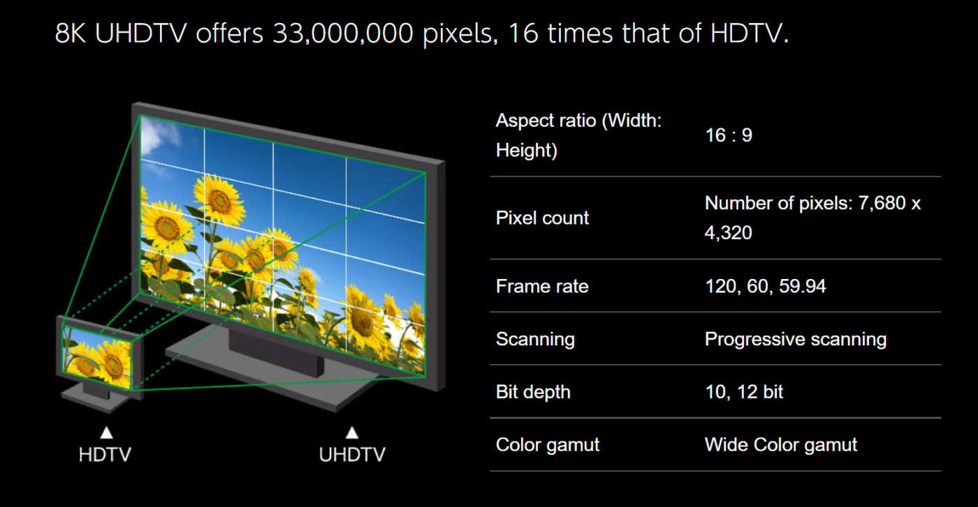 Con una risoluzione di 7680×4320 pixel (oltre 33 milioni di pixel), ben 4 volte il 4K e 16 volte il Full HD 1080p, promette visioni mozzafiato delle immagini Tv con un realismo che trasforma qualsiasi immagine in una scena reale con effetto 3D assolutamente naturale e coinvolgente.