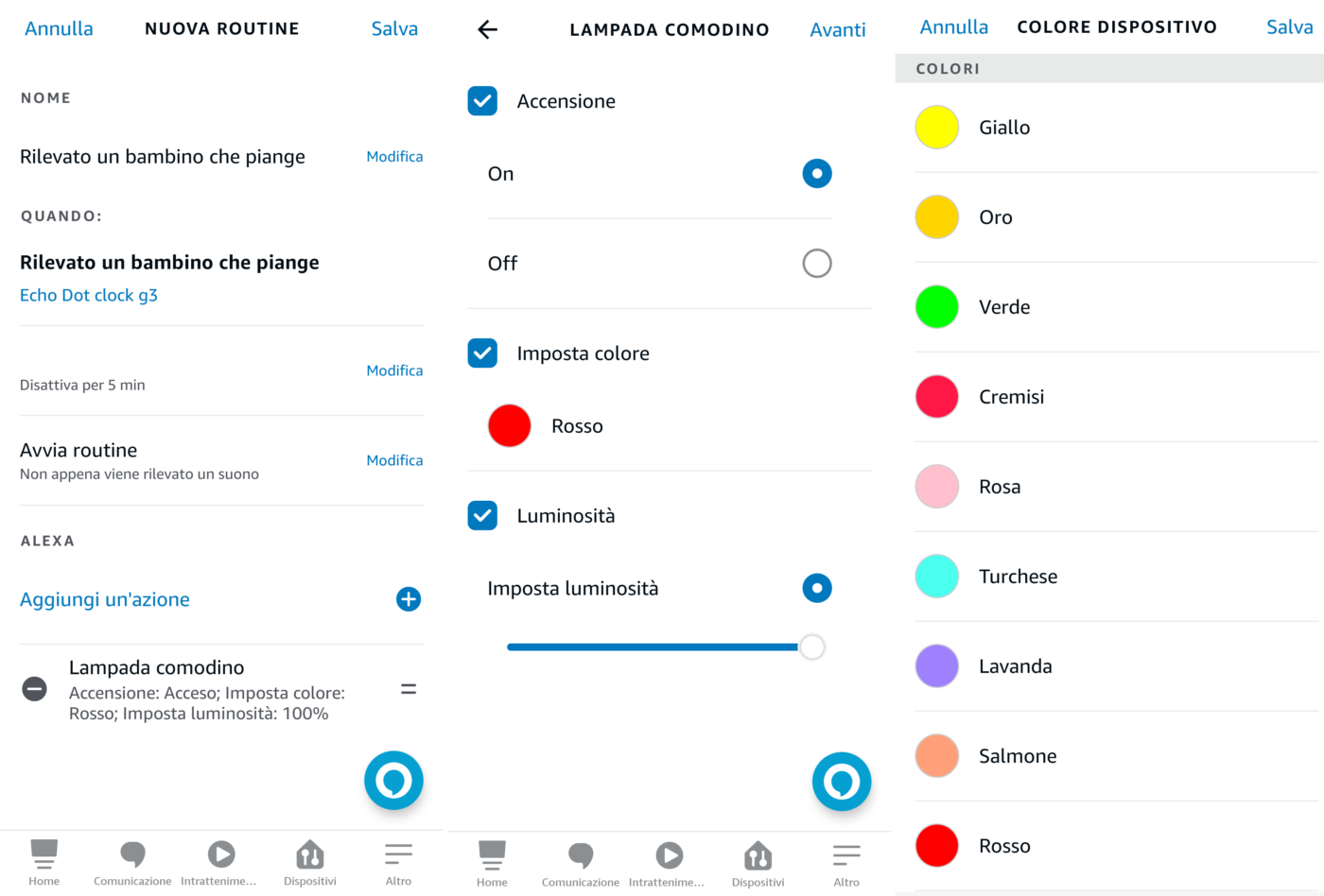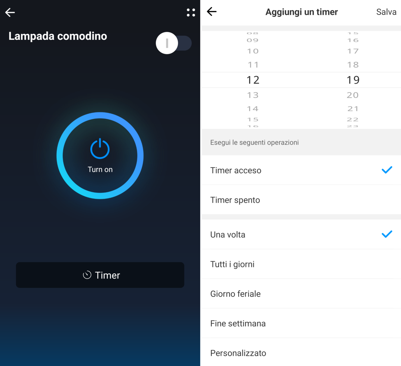 Le app permettono anche di creare uno o più timer per l’accensione e lo spegnimento automatizzati in base ad orari predefiniti (ad esempio l’accensione tenue al mattino per favorire il risveglio e lo spegnimento dopo esserci addormentati) ma anche scenari e routine personalizzati per accendere/spegnere la lampada e impostare la tonalità oppure il colore dei led in base agli orari di alba/tramonto oppure come conseguenza dell’attivazione di un altro dispositivo smart registrato nella stessa app (es.: luce rossa se i sensori ambientali rilevano porte o finestre lasciate aperte, perdite d’acqua o fughe di gas, gli smart speaker “sentono” rumori, ecc.).