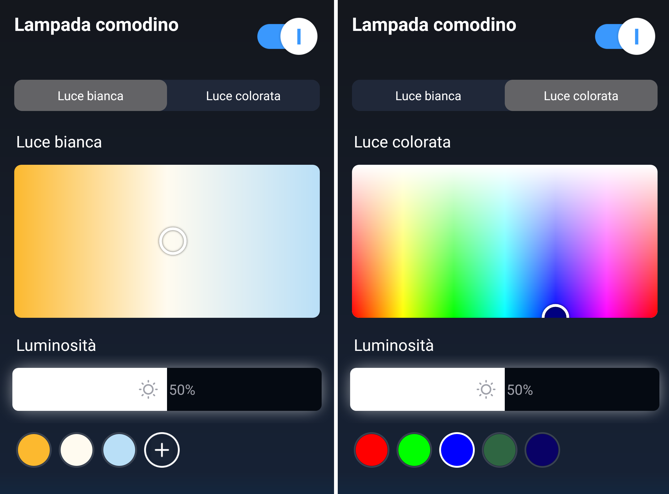 - Luce bianca: calda, naturale o fredda (2700K-6000K)