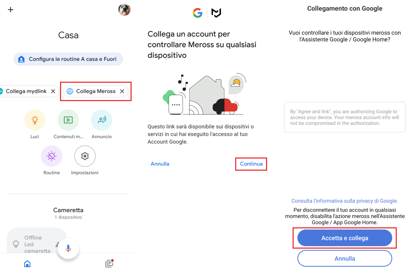 Per abilitare i comandi vocali basta aprire la app vista sopra, entrare nella pagina delle impostazioni generali o dell’account, selezionare la piattaforma vocale desiderata (Alexa, Google, ecc.), attivare l’apposita skill di Alexa (es.: Meross) oppure cercare il produttore della lampada nella lista di Google Home (aggiungi dispositivo > configura dispositivo > funziona con Google > nome produttore/brand) e abbinare i due account (es.: Meross e Amazon).