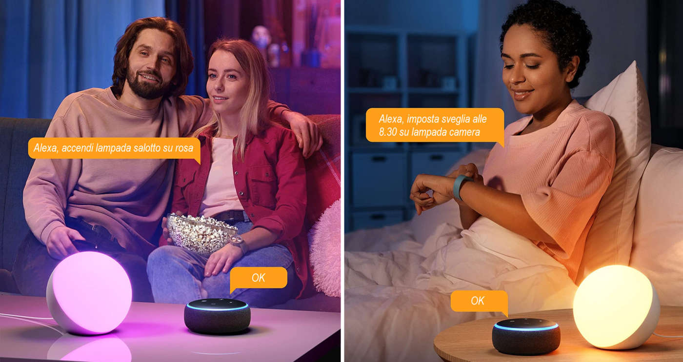 Completato l’abbinamento la lampada smart apparirà tra i dispositivi installati e si potrà gestirla anche con i comandi vocali (es.: “Hey Google, accendi/spegni la lampada salotto”, “Hey Google, accendi la lampada camera su verde”, “Alexa, metti luce studio a 20” oppure “Alexa, imposta sveglia alle 8h30 su lampada camera”), dal pannello comandi di Google e Alexa. E’ possibile anche inserire la lampada smart all’interno delle routine (Alexa e/o Google) per comandarla insieme ad altri dispositivi domotici (smart plug, smart switch, ecc.) e creare automazioni anche complesse per migliorare il confort e la sicurezza della casa e dei vostri cari.