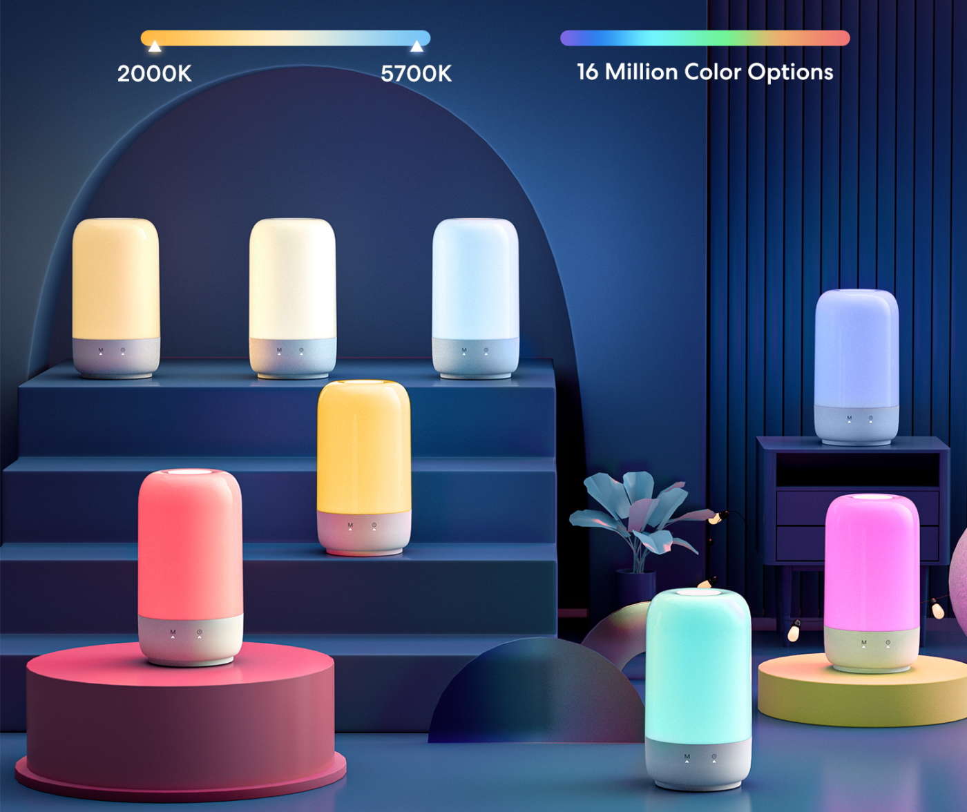 Lampada smart elegante e compatta, ideale per i comodini delle camere da letto (adulti, bambini, ragazzi, ecc.), dotata di chip RGBWW (bianco caldo/naturale/freddo e 16 milioni di colori) con una luminosità massima di 400 lumen.