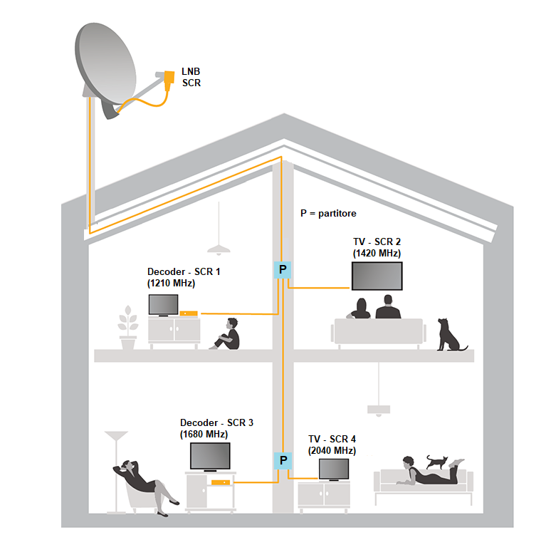 Di norma il partitore va posizionato in una scatola di derivazione e i cavi di uscita seguono lo stesso percorso dei cavi antenna terrestre così da arrivare comodamente nelle varie stanze. È possibile anche posizionare il partitore in salotto e collegarlo a vari decoder (es.: tivùsat, Sky HD, decoder Linux, ecc.). L’LNB SCR richiede una semplice programmazione da effettuare nel menu OSD del Tv/decoder (clicca qui per l’approfondimento tecnico).