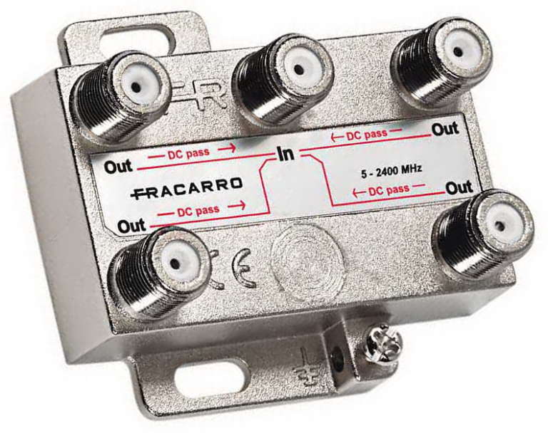 Da qui viene “splittato” (moltiplicato) per 2, 3, 4, ecc. a seconda delle prese utente da installare in 2, 3, 4 o più stanze. Per ottenere più uscite da un solo ingresso (cavo coassiale proveniente dall’LNB) si utilizza un partitore di segnale come questo.