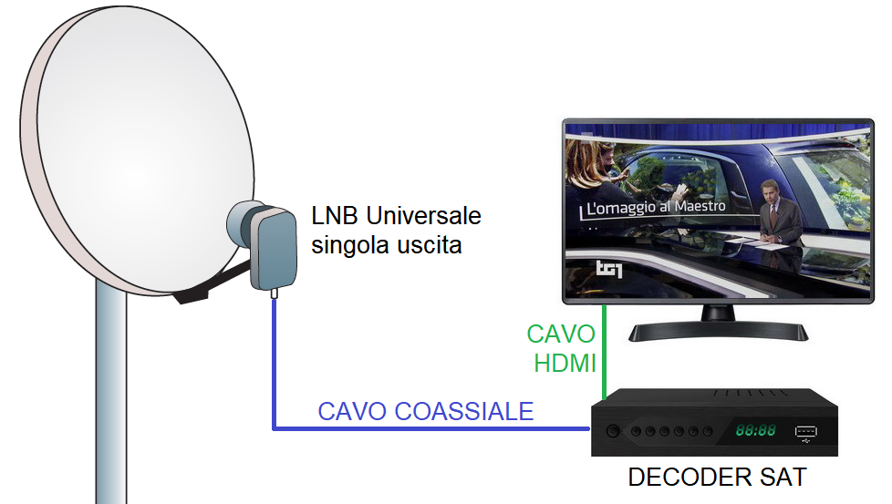 Per un impianto di ricezione satellitare “base” puntato verso un solo satellite (es.: Hotbird 13° Est per tivùsat) e collegato ad un solo Tv/decoder installato in salotto è sufficiente procurarsi un LNB universale con uscita singola.