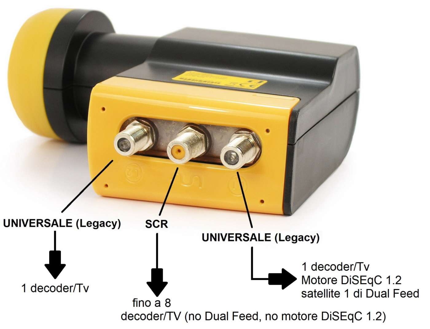 Ciò significa che un LNB SCR/dCSS non potrà mai essere utilizzato per una parabola Dual Feed a meno che lo stesso LNB abbia anche una o più uscite di tipo universale (chiamate “legacy”) ma con alcune complicazioni e limitazioni spiegate qui.