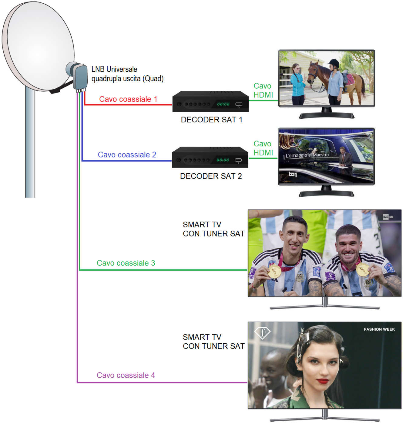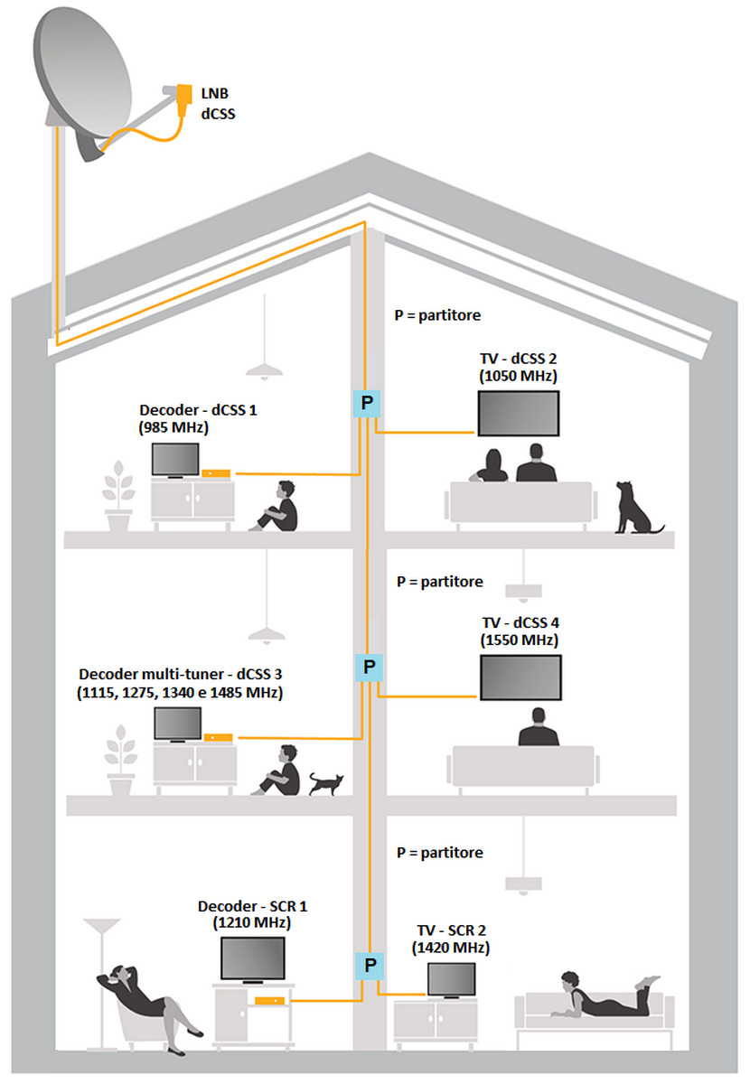 È invece la soluzione perfetta per un appartamento, villa o villetta su 1 o 2 livelli (es.: presa SAT1 in salotto, SAT2 in cucina, SAT3 in camera da letto, SAT4 in taverna).