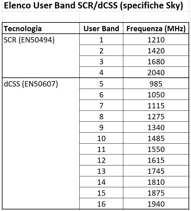 Le richieste simultanee corrispondenti al numero di user band a disposizione possono arrivare fino a 32, ovvero 4-8 volte la “capacità” dell’SCR (4-8 user band). Ventiquattro user band possono essere gestite unicamente dai decoder o dai Tv dotati di tuner DVB-S/S2 compatibili dCSS mentre per le rimanenti otto è sufficiente il supporto SCR (praticamente universale) che, quindi, viene inglobato e non sostituito dal dCSS. Alcuni dispositivi e operatori come Sky limitano il numero di user band a 16 (12 dCSS e 4 SCR) per evitare rischi di interferenze e garantire una maggiore affidabilità negli impianti centralizzati. Nella tabella sono riportate le 16 user band e le relative frequenze conformi alle specifiche di Sky ed utilizzate in altri apparecchi dCSS (tra cui i nuovi LNB Emme Esse Xtra Line) distribuiti e installati in Italia.