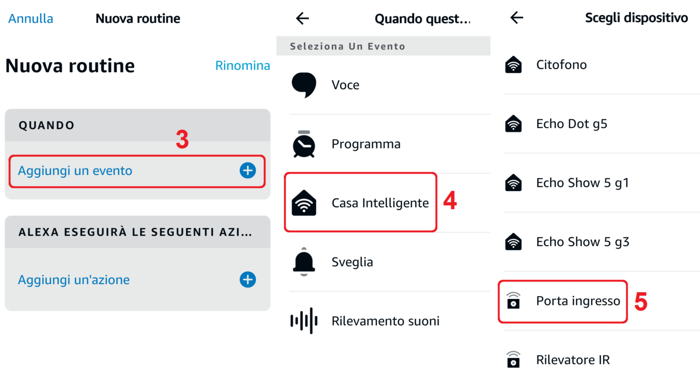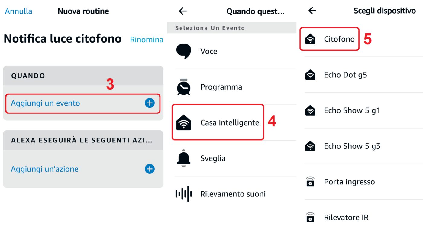 - Nella finestra Quando cliccate su Aggiungi un evento +, selezionate Casa Intelligente, poi Citofono e infine su Salva;