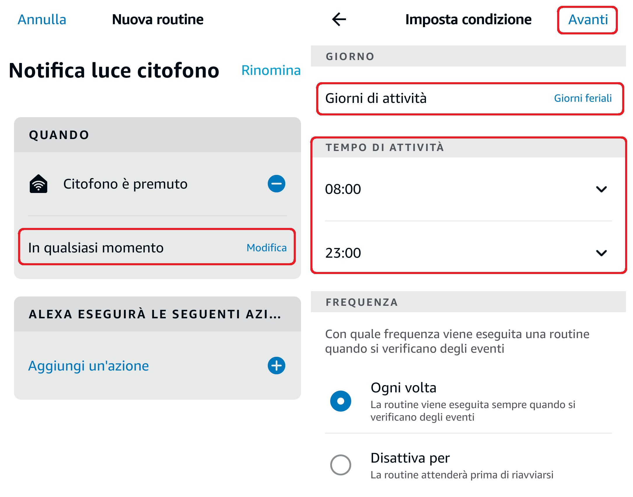 - Per modificare giorni e orari di attivazione cliccate su Modifica (in qualsiasi momento), scegliete le opzioni desiderate e cliccate su Avanti;