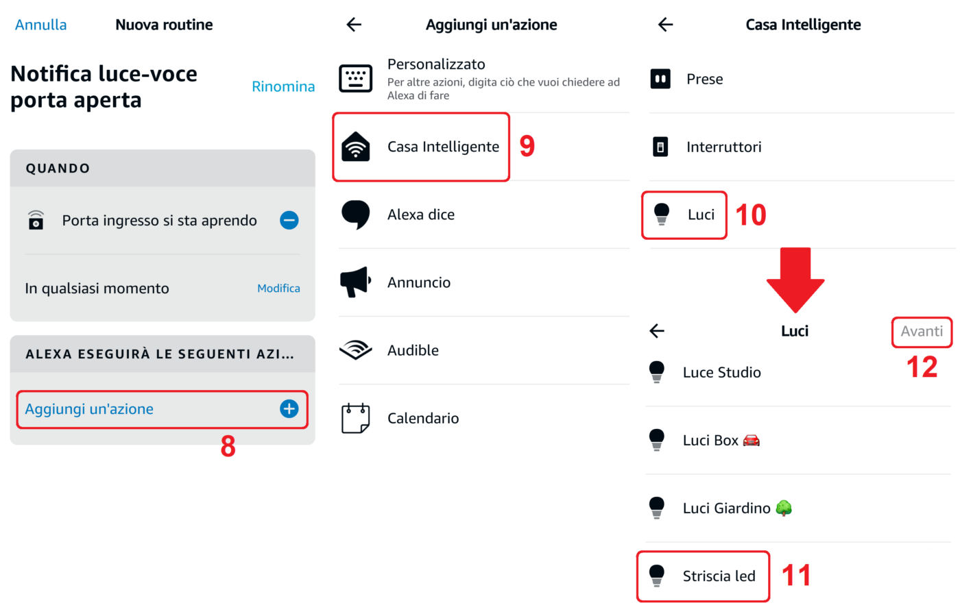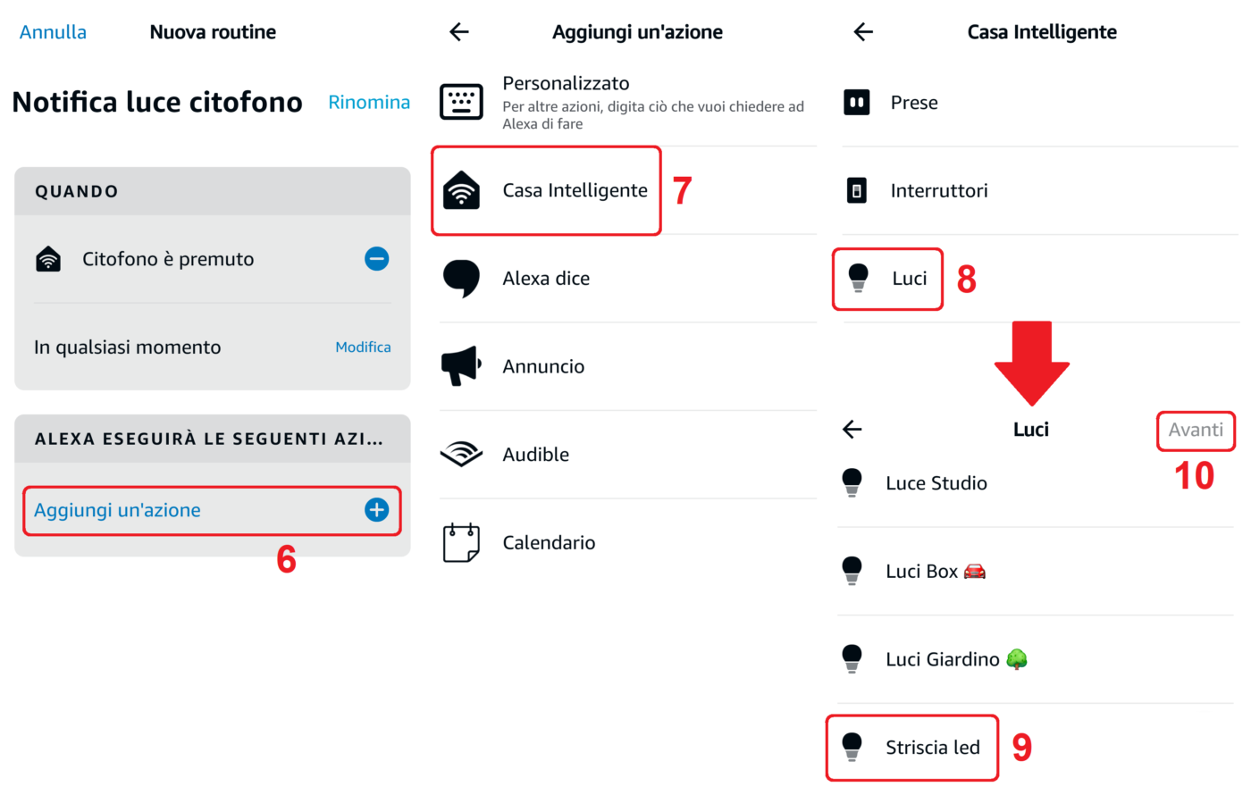 - Nella finestra Alexa eseguirà le seguenti azioni cliccate su Aggiungi un’azione +, selezionate Casa Intelligente, poi Luci, il dispositivo luci che volete attivare (es.: Striscia led) e cliccate su Avanti;