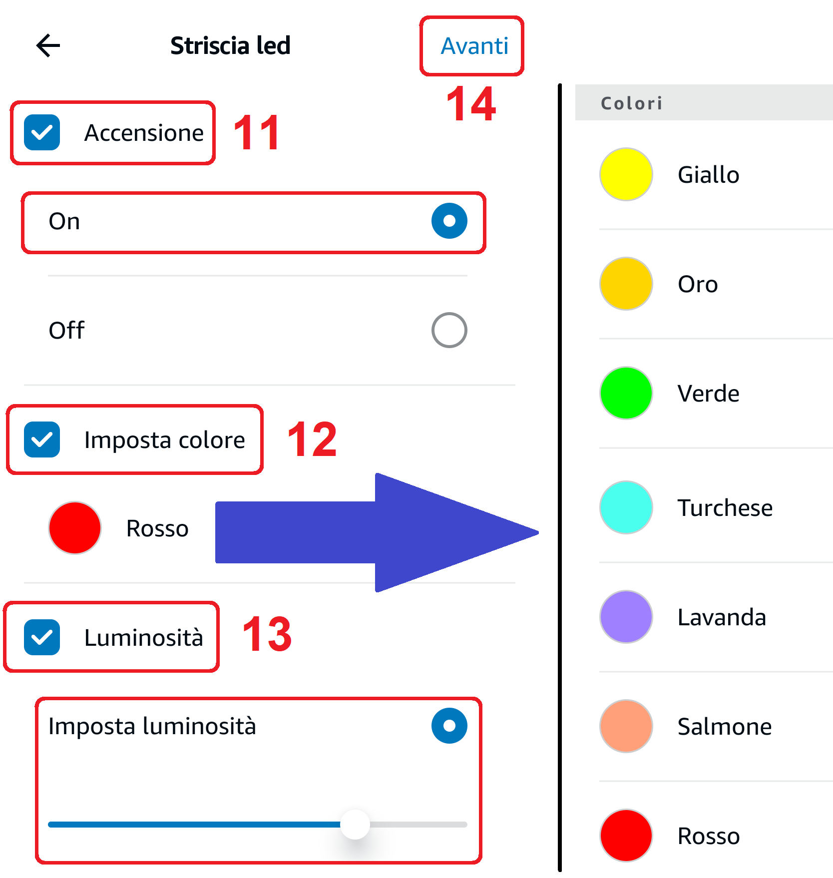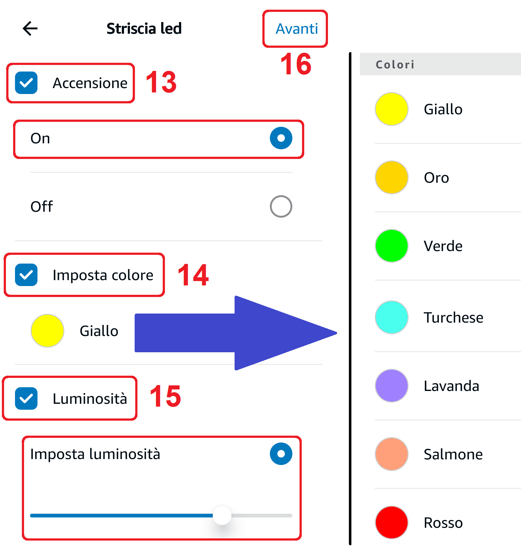 - Nella finestra di personalizzazione del dispositivo mettete la spunta su Accensione/On, su Imposta colore (sceglietelo dalla palette) e su Luminosità (regolate lo slider). Al termine cliccate su Avanti;