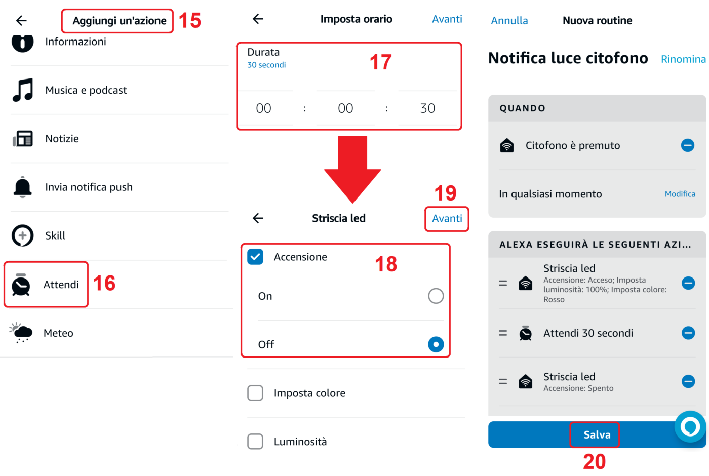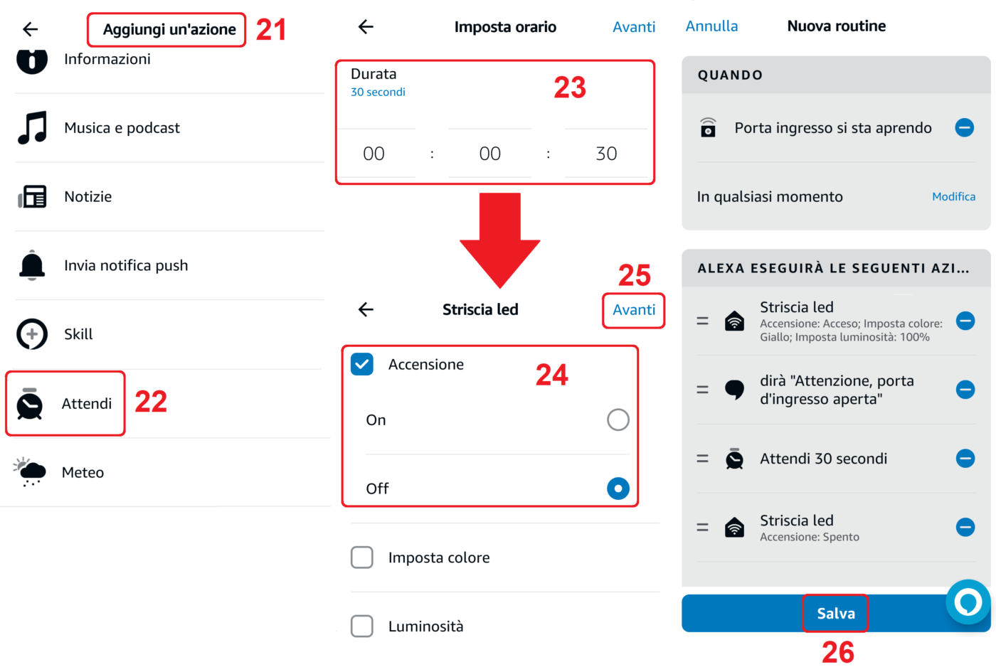 - Quando riappare la schermata di creazione della routine cliccate su Salva e attendete qualche minuto prima di testarla. Se preferite che la luce si spenga dopo alcuni secondi o minuti aggiungete l’azione Attendi, selezionate la durata (es.: 30 secondi) e cliccate su Avanti. Ripetete il punto 5 mettendo la spunta solo su Accensione/Off, cliccate su Avanti e infine su Salva.