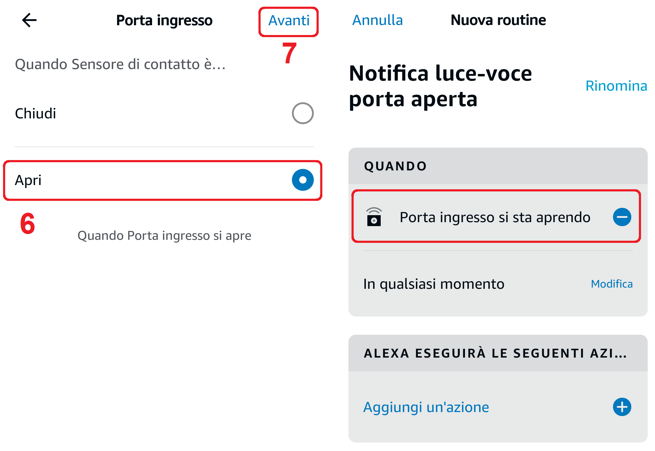 ROUTINE 2 – Striscia led o lampadina accesa (colore a scelta) e avviso vocale Alexa quando si apre la porta di ingresso