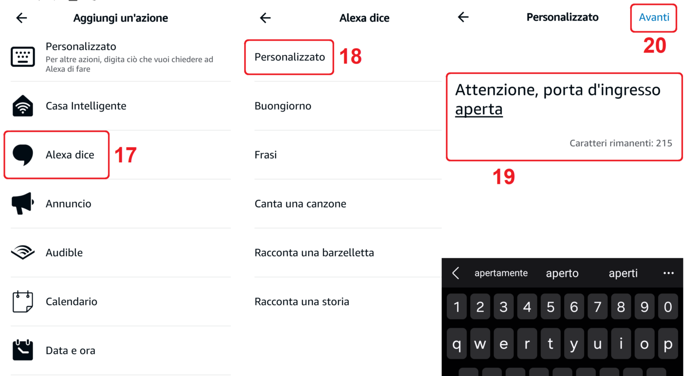 - Nella finestra Alexa eseguirà le seguenti azioni cliccate su Aggiungi un’azione +, selezionate Alexa Dice, cliccate su Personalizzato, digitate la frase che Alexa pronuncerà quando la porta si apre (es.: Attenzione, porta d’ingresso aperta – massimo 250 caratteri) e cliccate due volte su Avanti;
