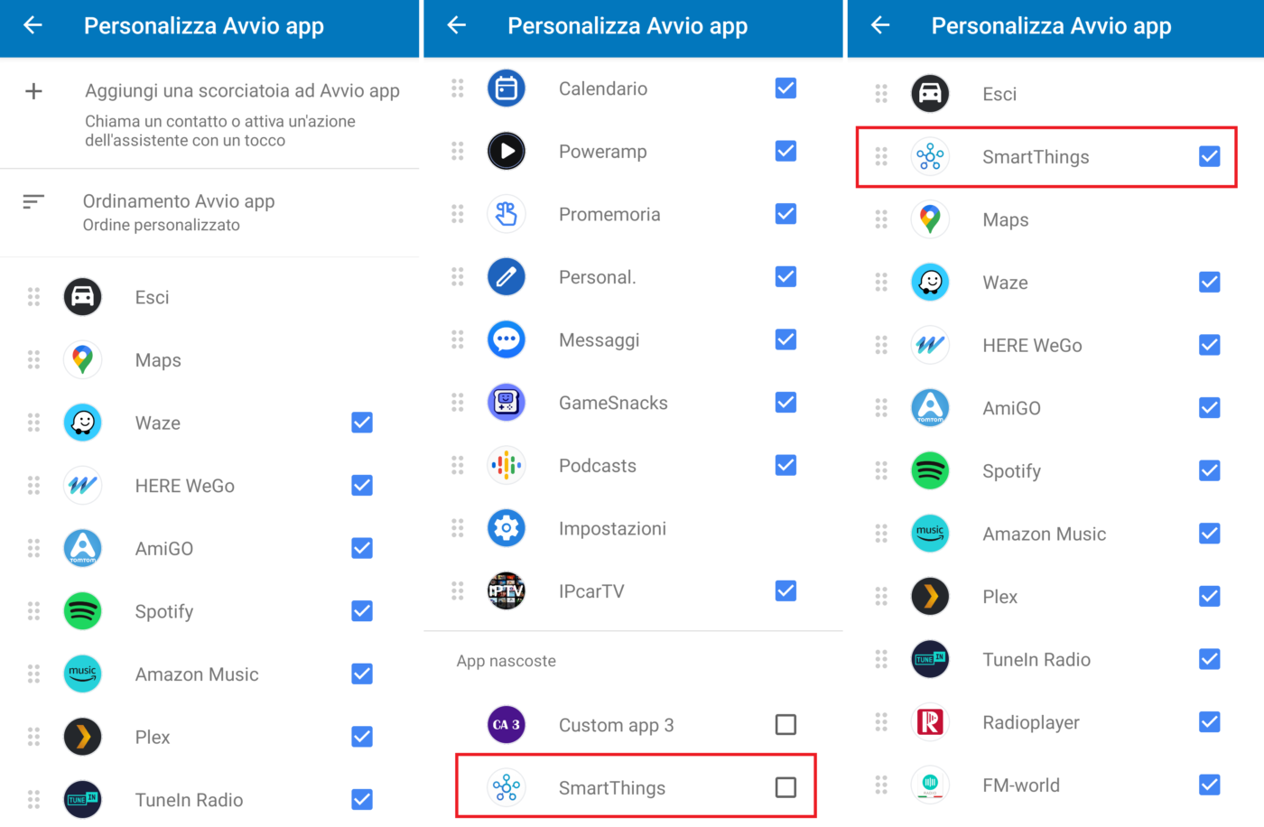 Cliccate sulla voce “Personalizza Avvio app”, scorrete l’elenco verso il basso, mettete la spunta su SmartThings e trascinatela verso l’alto cliccando sui puntini a sinistra in modo da posizionarla tra le prime app di Android Auto. Al termine cliccate sulla freccia in alto a sinistra.