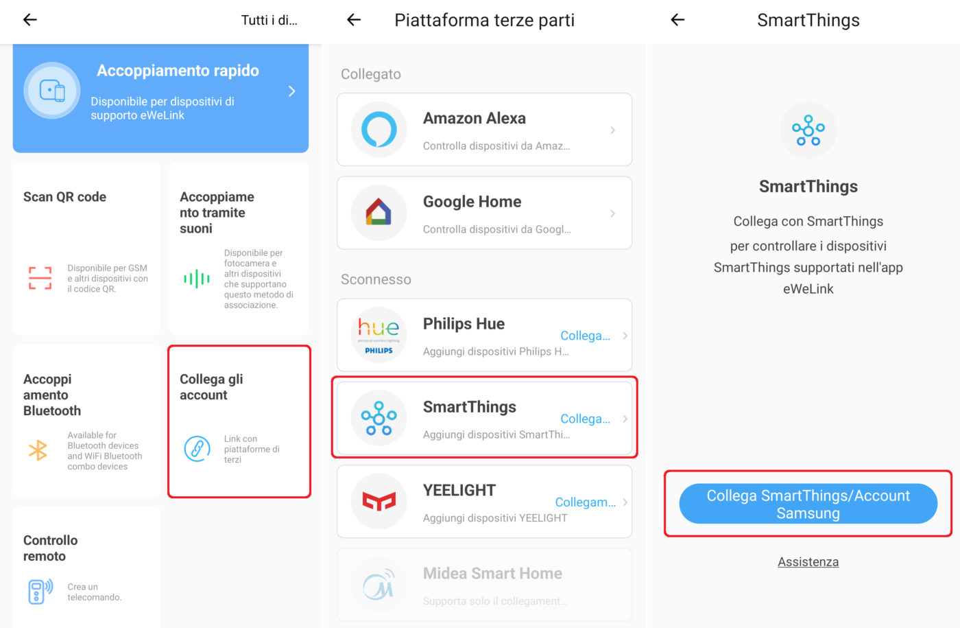 Per svolgere questo compito, SmartThings richiede che il suo account (Samsung) venga abbinato a quello delle app smart “proprietarie” (es.: Ewelink, Meross, ecc.) così da rilevare i dispositivi domotici installati, acquisirli e controllarli dalla sua app.