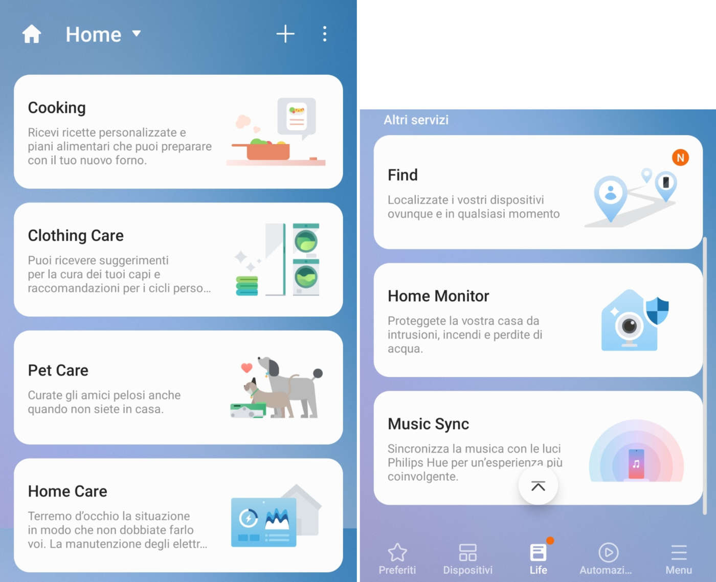 La sezione Life fornisce informazioni utili per monitorare e gestire il consumo energetico dei dispositivi, il lavaggio e la cura dei capi di abbigliamento, la localizzazione dei dispositivi smart tag e molto altro.