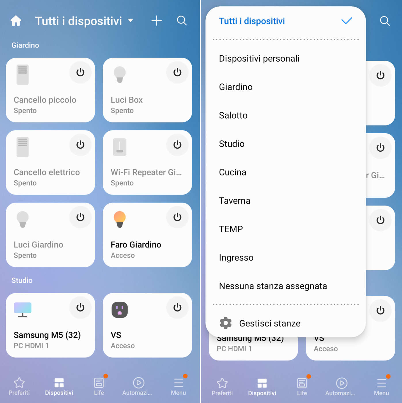 Nella sezione Preferiti troviamo solo quei dispositivi che sono stati selezionati nell’elenco generale (dispositivo > tre puntini in alto a destra > Modifica > Imposta come preferito) per rendere più semplice e immediato il loro controllo.