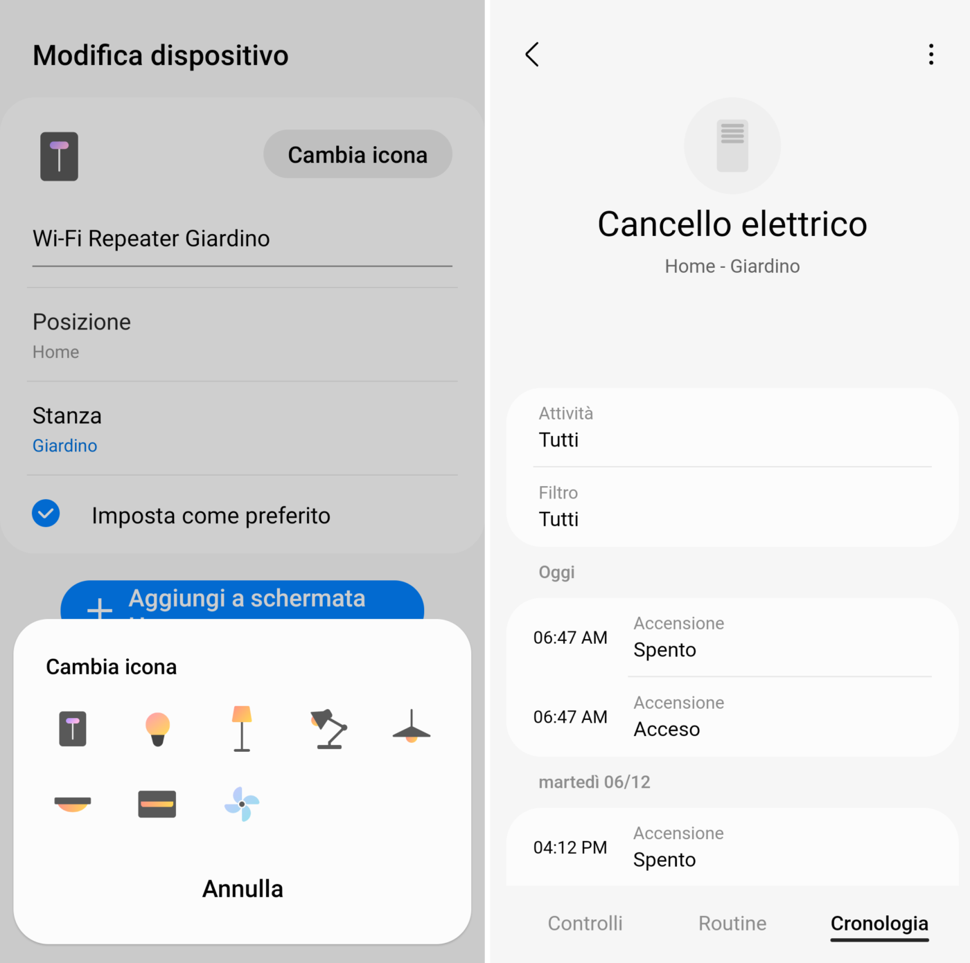 È possibile anche scegliere un’icona per meglio identificarlo (interruttore, lampadina, ventilatore, luce scrivania, piantana, ecc.) e consultare la cronologia che mostra date e orari di attività, ovvero quando il dispositivo è stato acceso o spento.