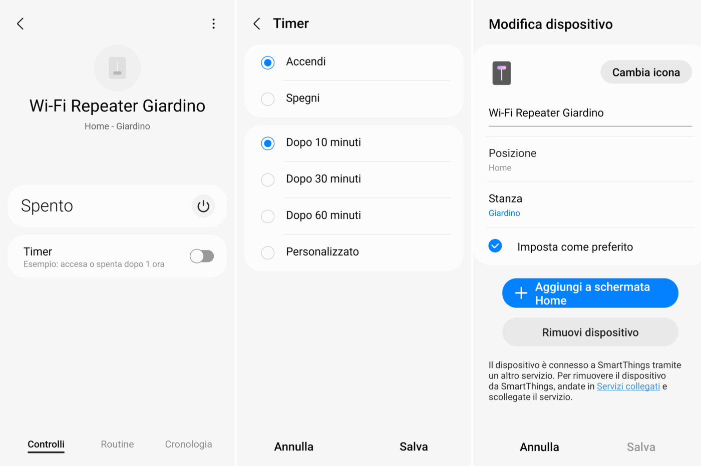 Toccando l’icona del dispositivo è possibile accenderlo e spegnerlo, impostare un timer per l’accensione e lo spegnimento automatici (dopo 10, 30, 60 minuti o personalizzato, acceso tutti i giorni alle ore 12 e spento alle 23, ecc.), inserirlo nella “lista preferiti” (vedi sotto) e aggiungerlo alla schermata home dello smartphone Android.