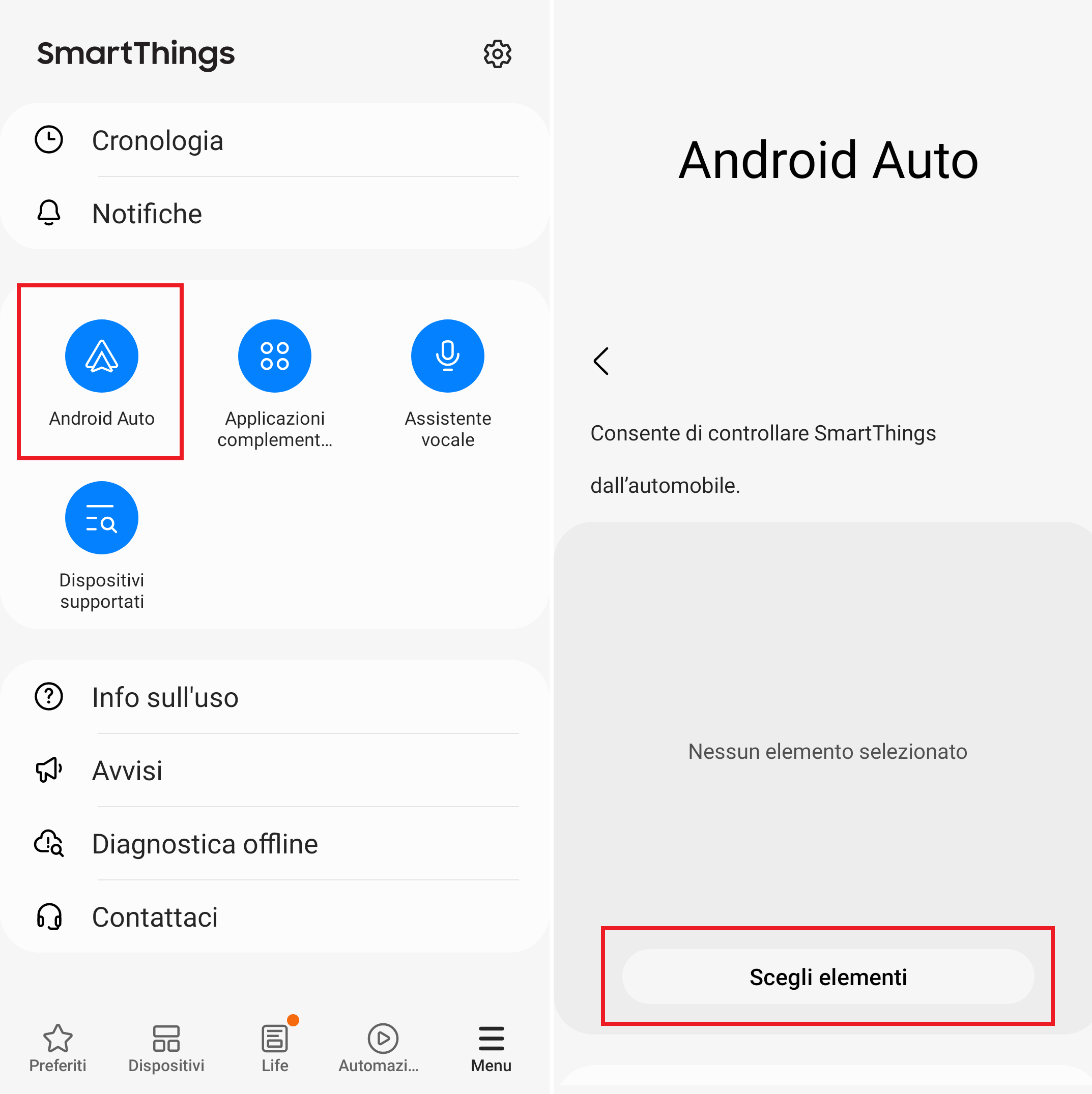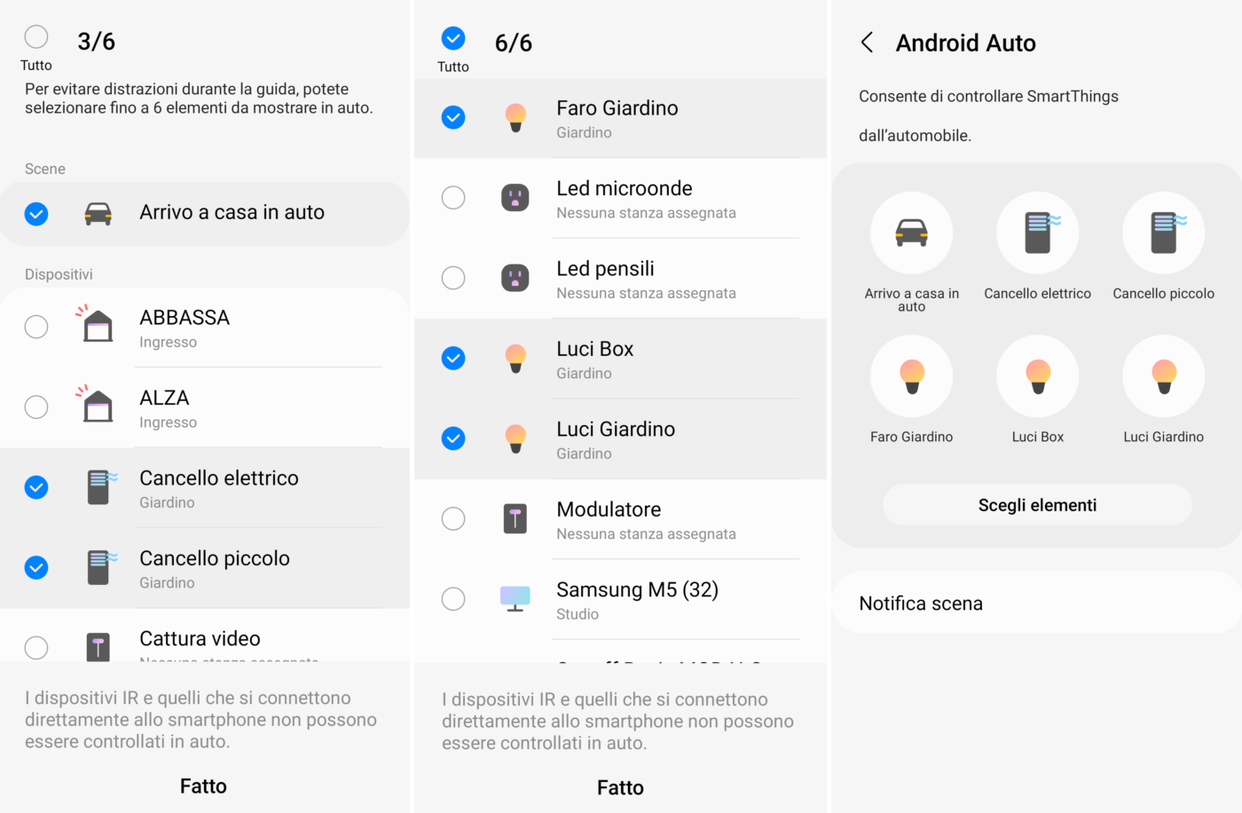 Cliccate su “Scegli elementi” e mettete la spunta sui dispositivi e gli scenari (come quello creato sopra) che volete far comparire in Android Auto (fino ad un massimo di 6) per l’accesso diretto dal display del vostro infotainment. Al termine della selezione cliccate su “Fatto”.