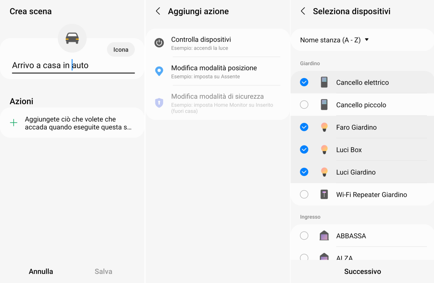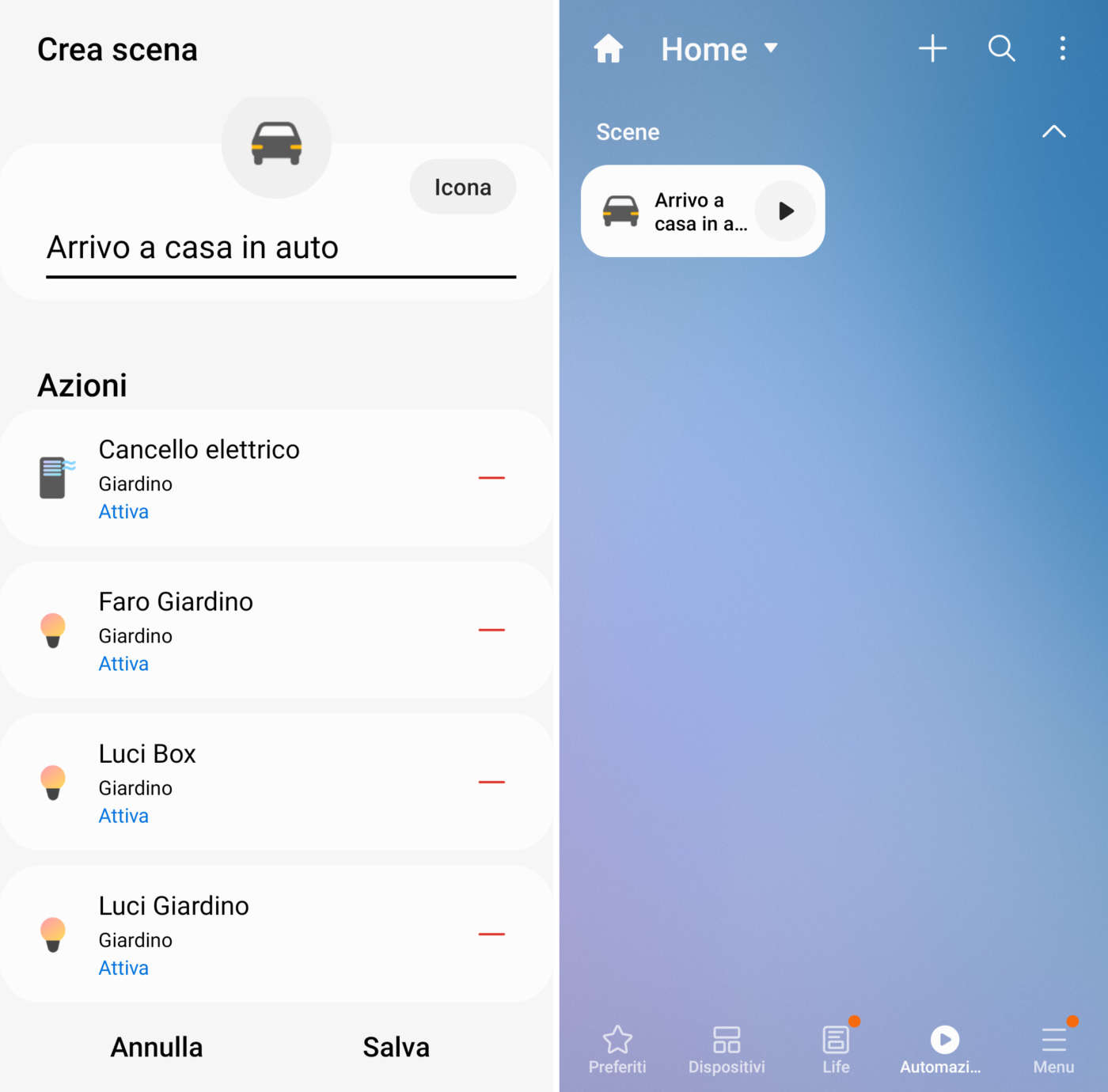 Ad esempio, in pochi secondi potete creare una scena chiamata “Arrivo a casa in auto” che, con un solo tocco, apre il cancello elettrico (già domotizzato o modificato come spiegato in questo articolo), accende le luci del giardino e del box.