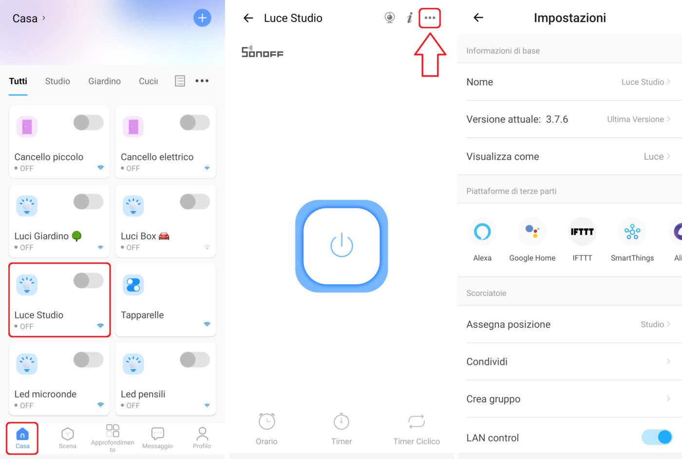 Nella app eWeLink trovate diverse impostazioni dedicate alla configurazione dello smart switch e al controllo dei punti luce.