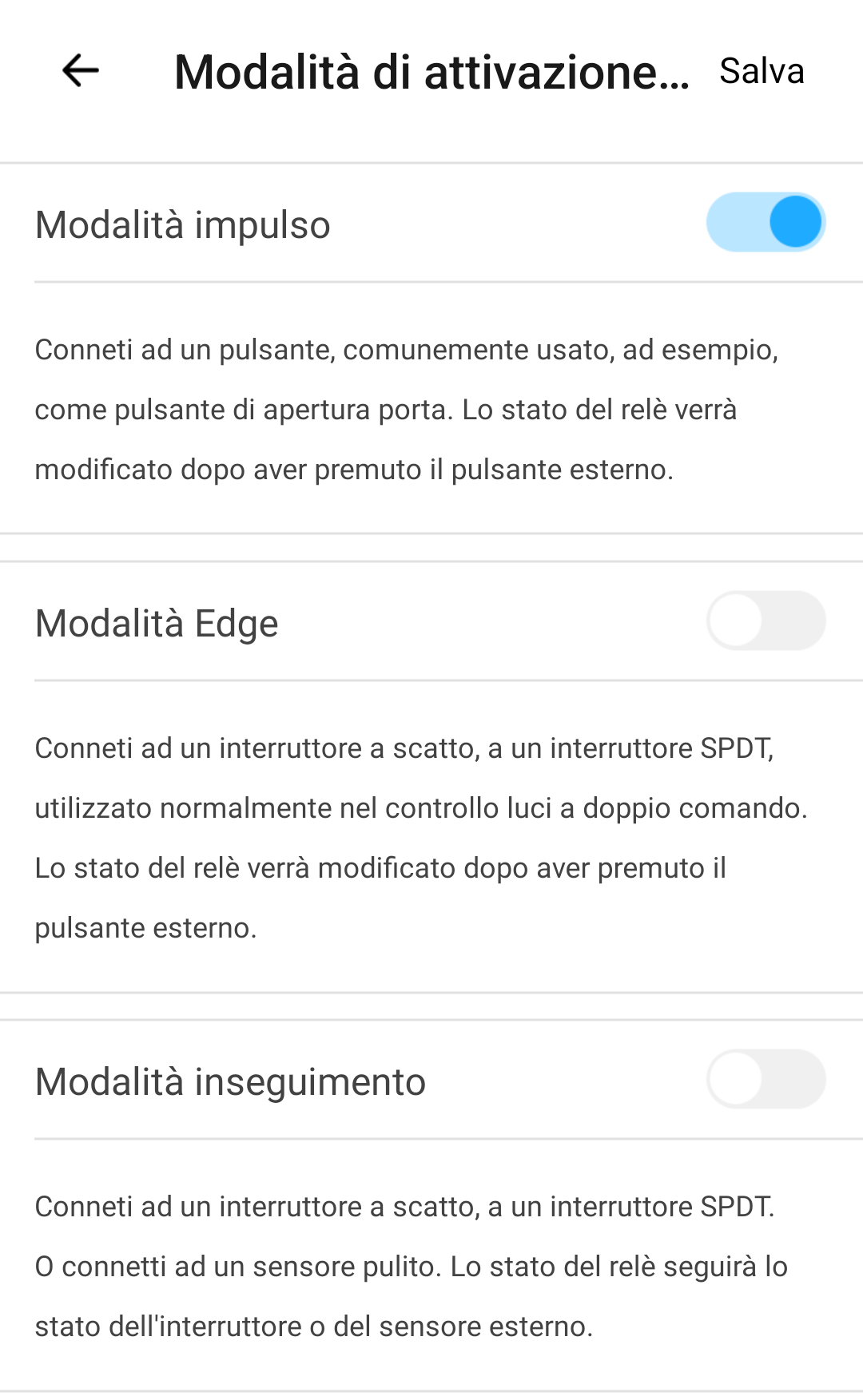 - Cambia modalità – permette di selezionare una delle tre modalità di comando disponibili (impulso, edge o inseguimento) in base al dispositivo collegato ai morsetti S1/S2 (pulsante, interruttore/deviatore, sensore, ecc.). Per gli impianti luce diretti/derivati/invertiti con interruttore/deviatore impostare la modalità edge (default) mentre per gli impianti luce diretti con pulsante impostare la modalità impulso;