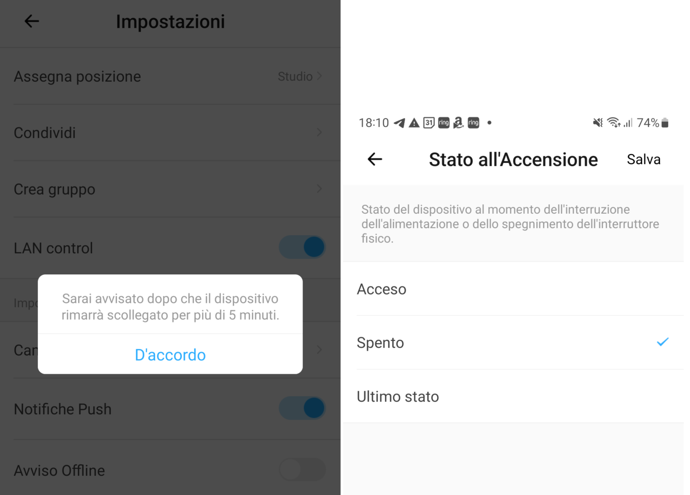 - Avviso Offline – se attivato, lo smartphone riceverà dallo smart switch una notifica immediata quando viene a mancare la connessione (internet, Wi-Fi, ecc.);