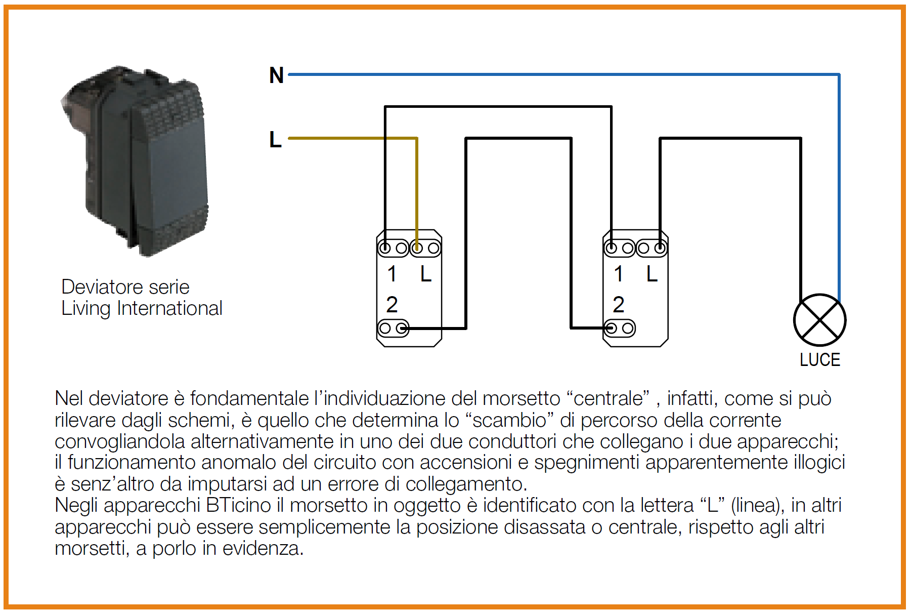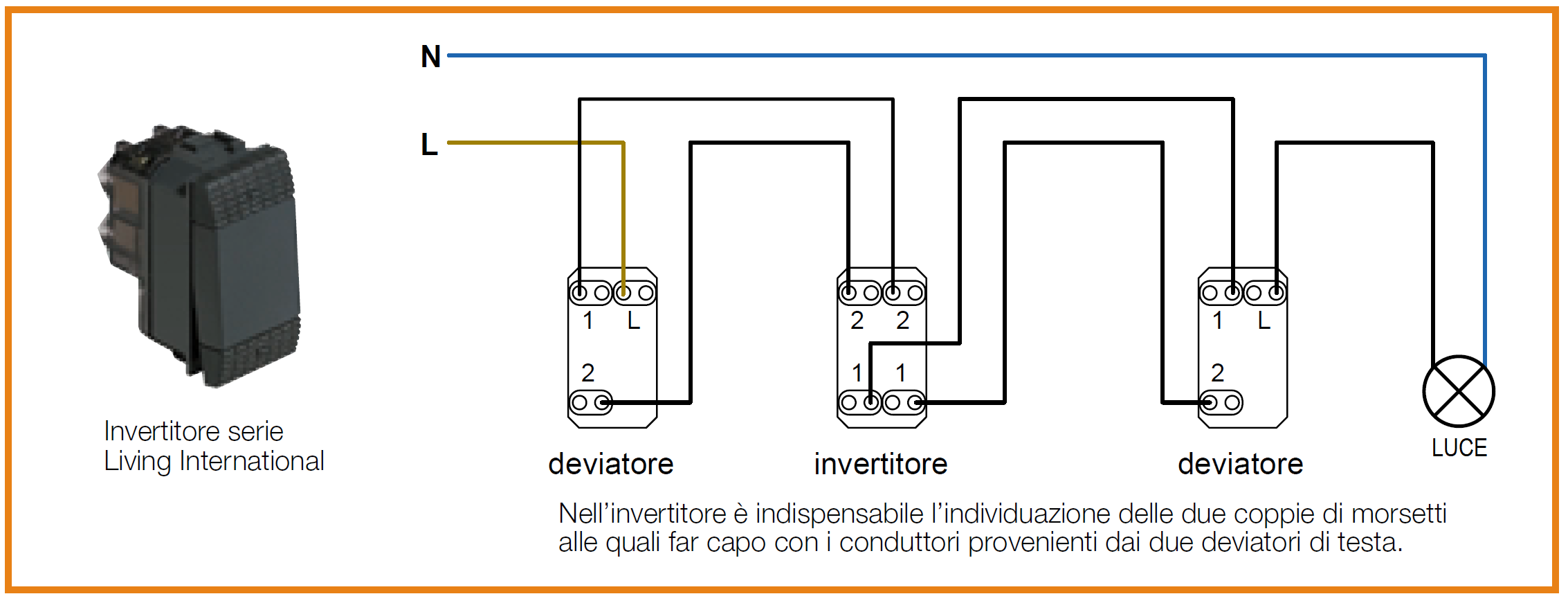 In questo caso si utilizzano due deviatori (da 3 morsetti – L, 1, 2) e uno o più invertitori (da 4 morsetti – 1, 1, 2, 2) interconnessi tra loro come mostrato in questo scherma: