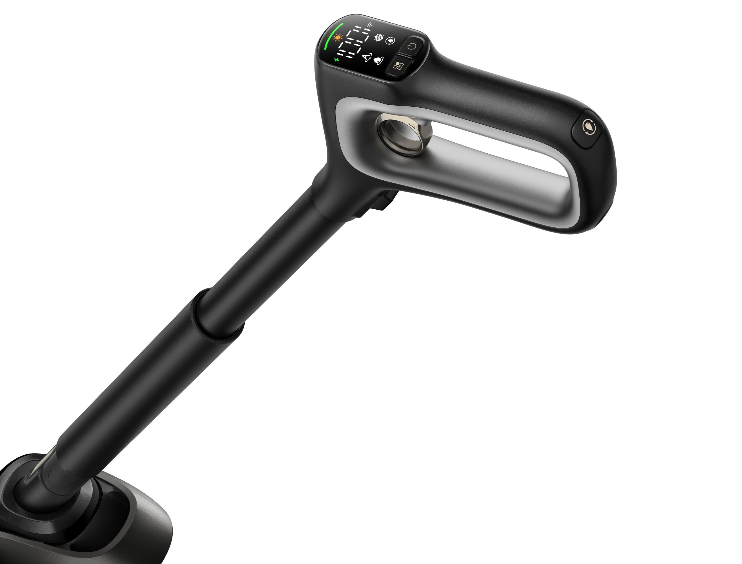 In pratica, permette di raggiungere facilmente gli spazi sotto letti, divani e mobili bassi senza piegarsi né spostare nulla. Il bilanciamento del peso è ben studiato: la macchina resta stabile e si manovra agevolmente anche con una sola mano, mentre la ruota motorizzata continua ad assistere i movimenti.