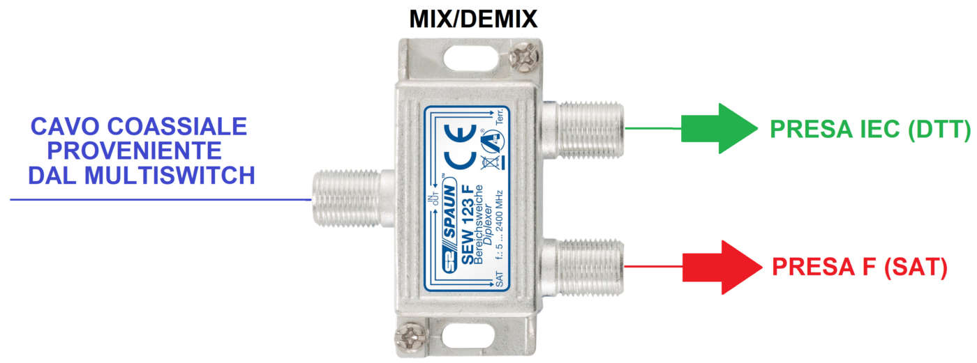 Basta utilizzare un demiscelatore esterno (con uscite DTT e SAT) oppure una presa Tv-Sat già demiscelata e disponibile come “frutto” per la maggior parte delle serie civili (BTicino, Gewiss, Vimar, ecc.).