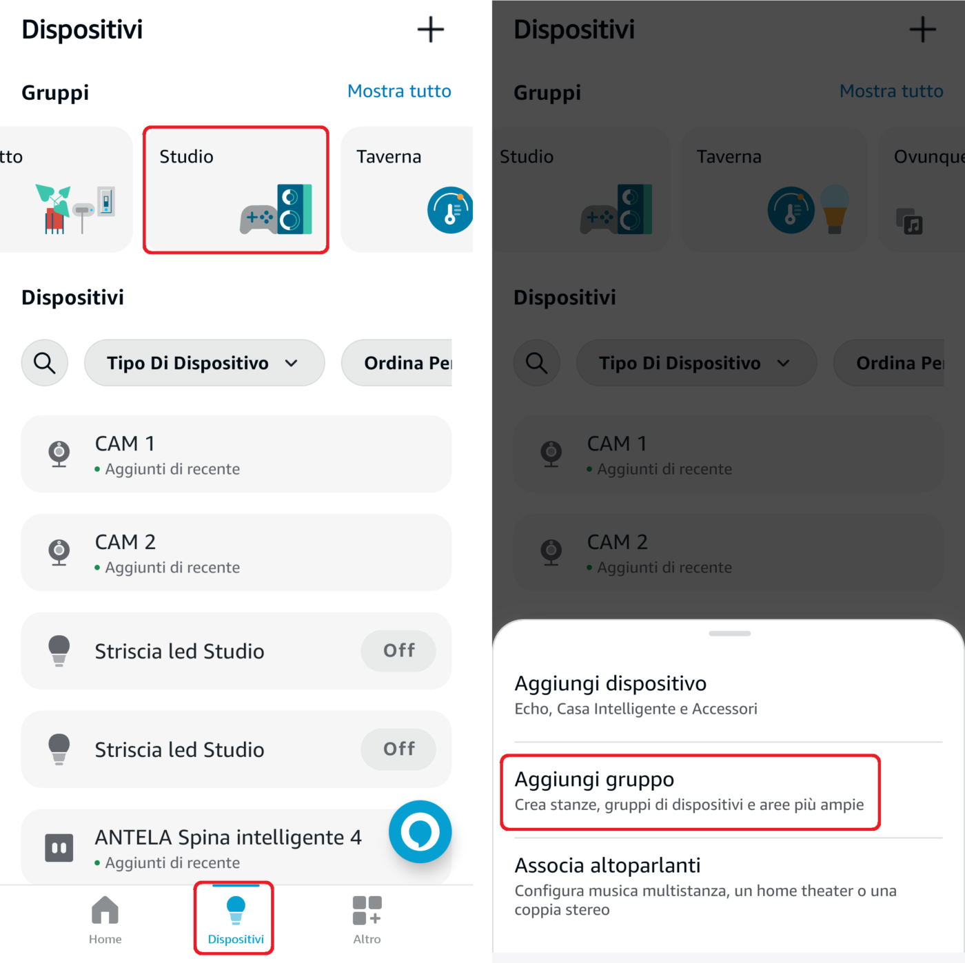 - Aprite la app Alexa, cliccate in basso su Dispositivi, selezionate la stanza già presente nei Gruppi (scorrete da destra a sinistra) oppure cliccate in alto su + e selezionate Aggiungi gruppo;