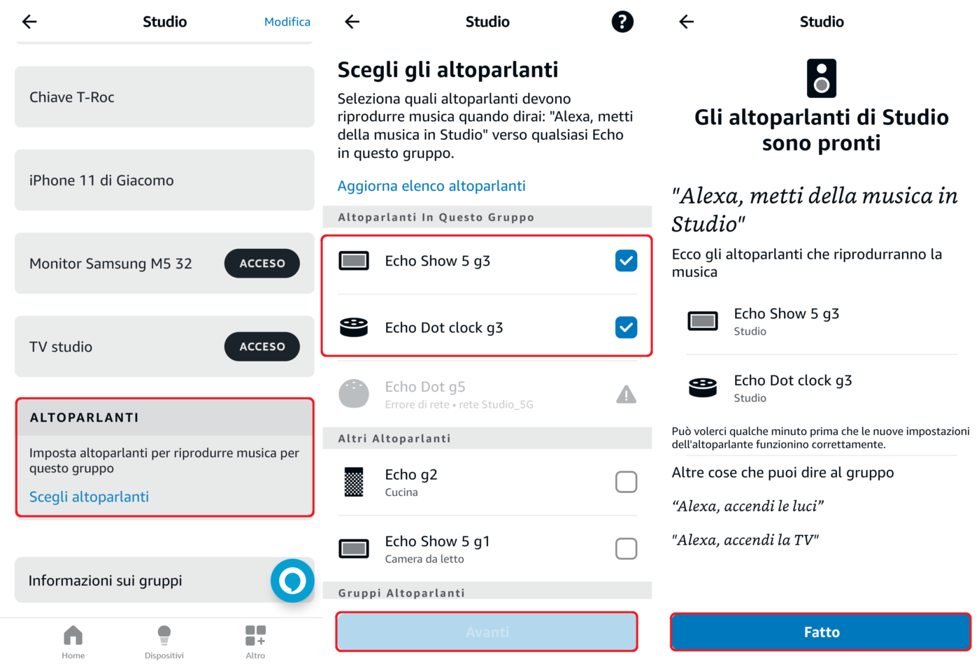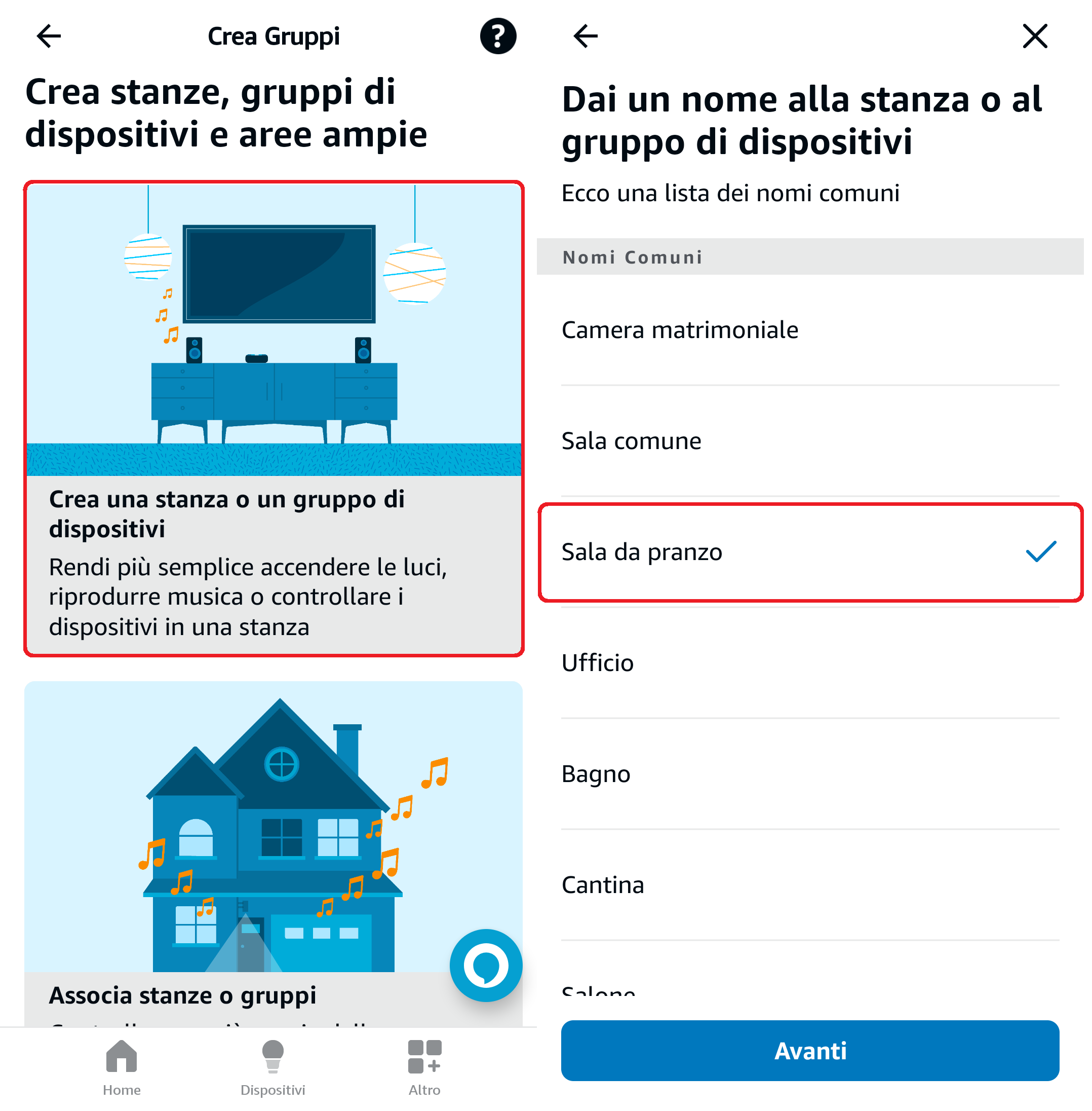 - Se, invece, non avete ancora creato un gruppo cliccate su Crea una stanza o un gruppo di dispositivi e seguite le istruzioni della app (nome stanza, aggiunta dispositivi, aggiunta dispositivi Alexa, ecc.).