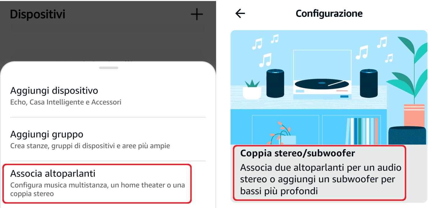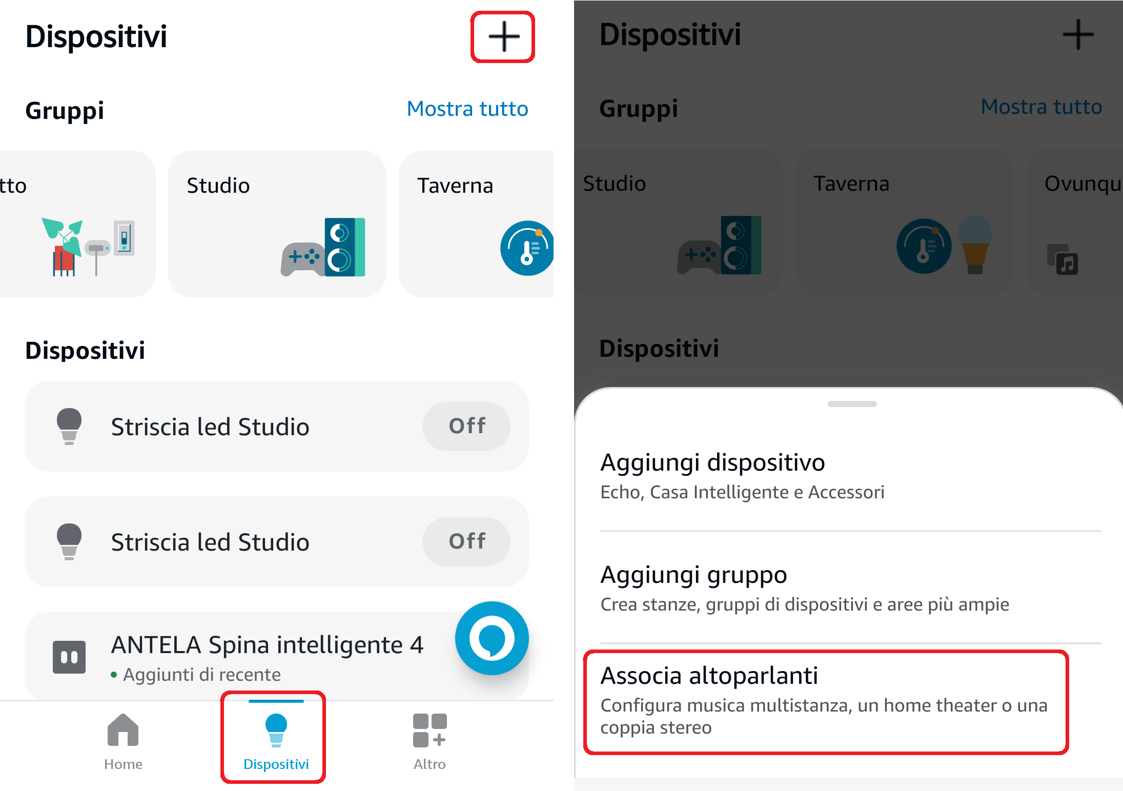 - Aprite la app Alexa, cliccate in basso su Dispositivi, poi su + in alto a destra e selezionate Associa altoparlanti dal menu a tendina;