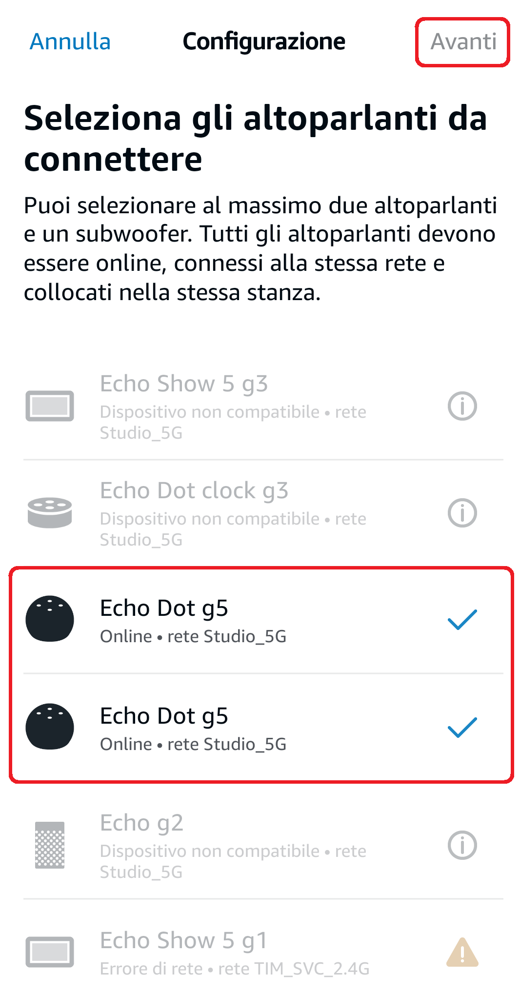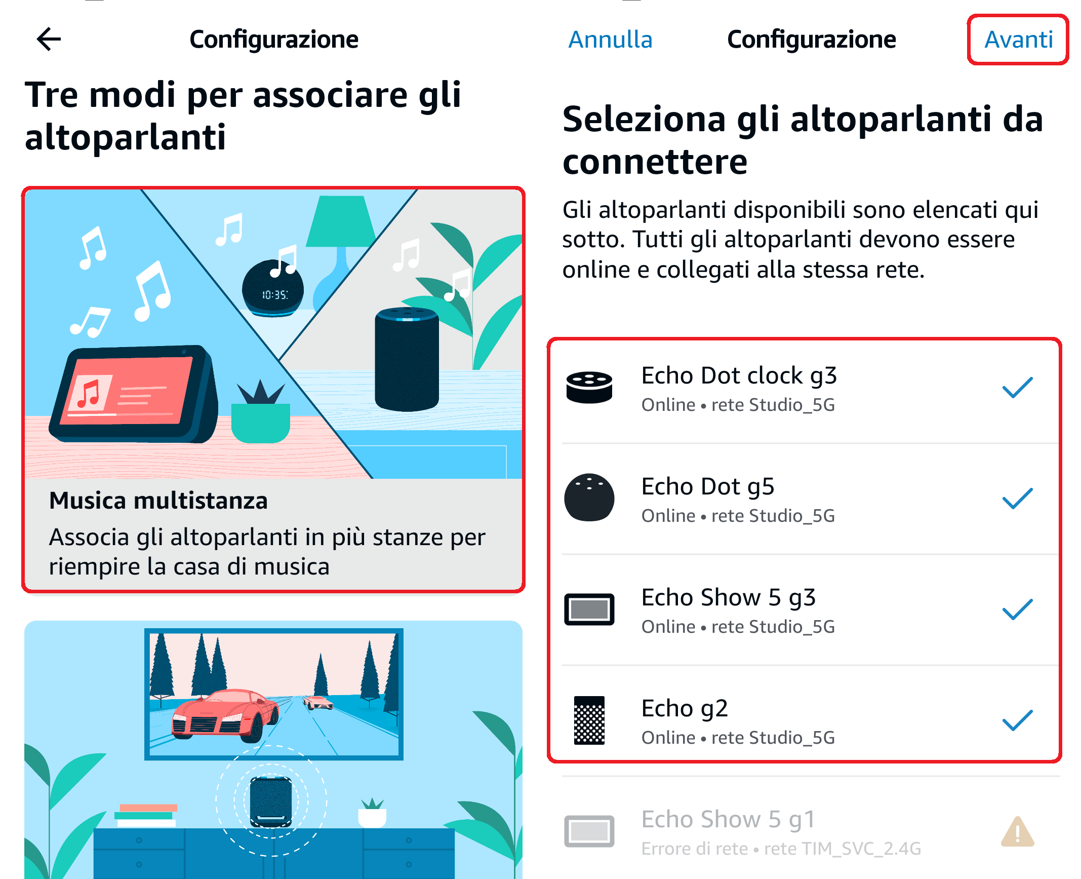 - Cliccate su Musica Multistanza, selezionate gli altoparlanti da utilizzare (solo quelli connessi allo stesso Wi-Fi) e cliccate Avanti in alto a destra;