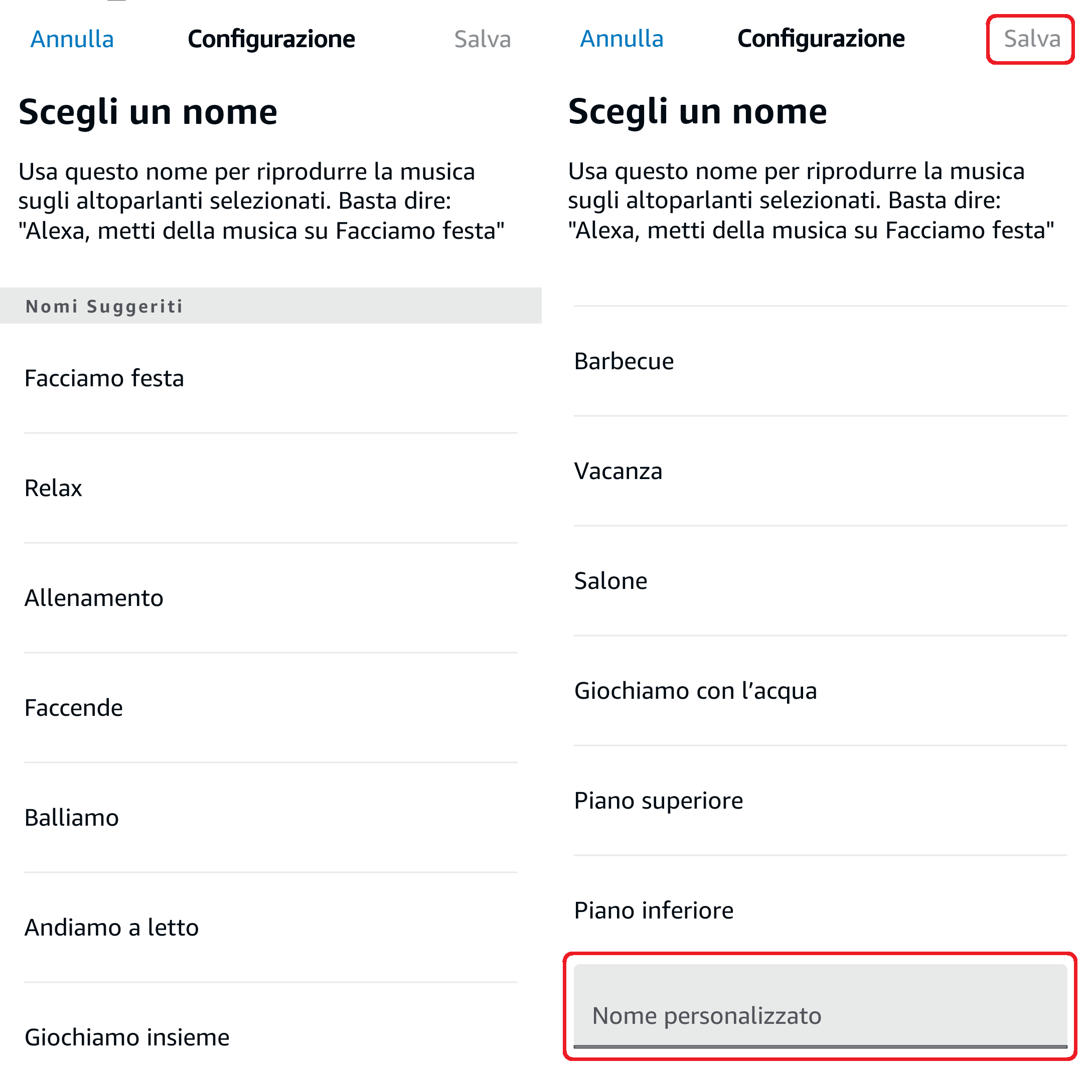 - Scegliete un gruppo suggerito in elenco (es.: Facciamo festa) oppure scorrete in basso e cliccate su Nome personalizzato e digitatelo. Al termine cliccate su Salva in alto a destra;