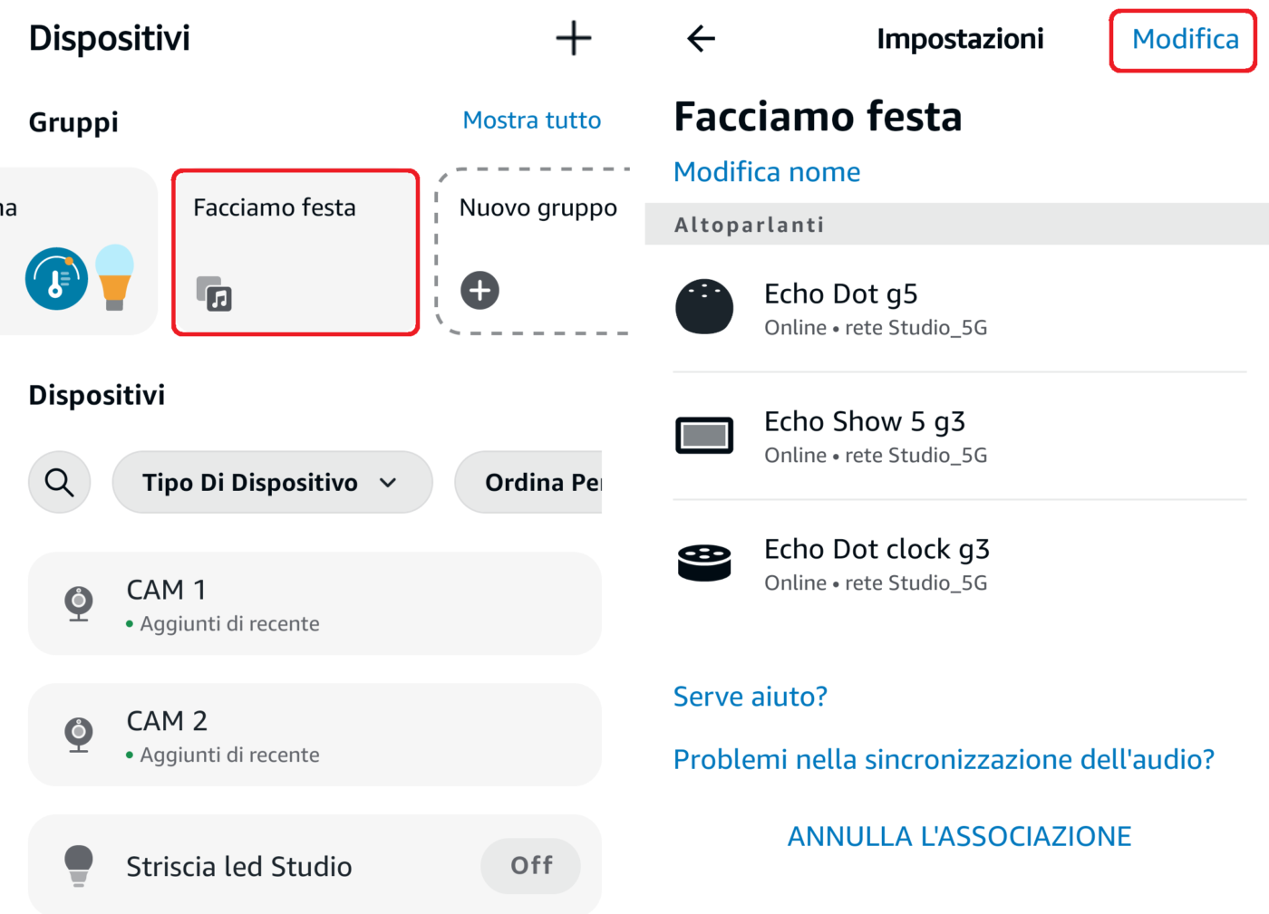 - Scorrete i gruppi in alto fino a trovare quello appena creato (es.: Facciamo festa), cliccatelo e controllate gli altoparlanti che avete associato. Per aggiungerli o toglierli cliccate in alto su Modifica;